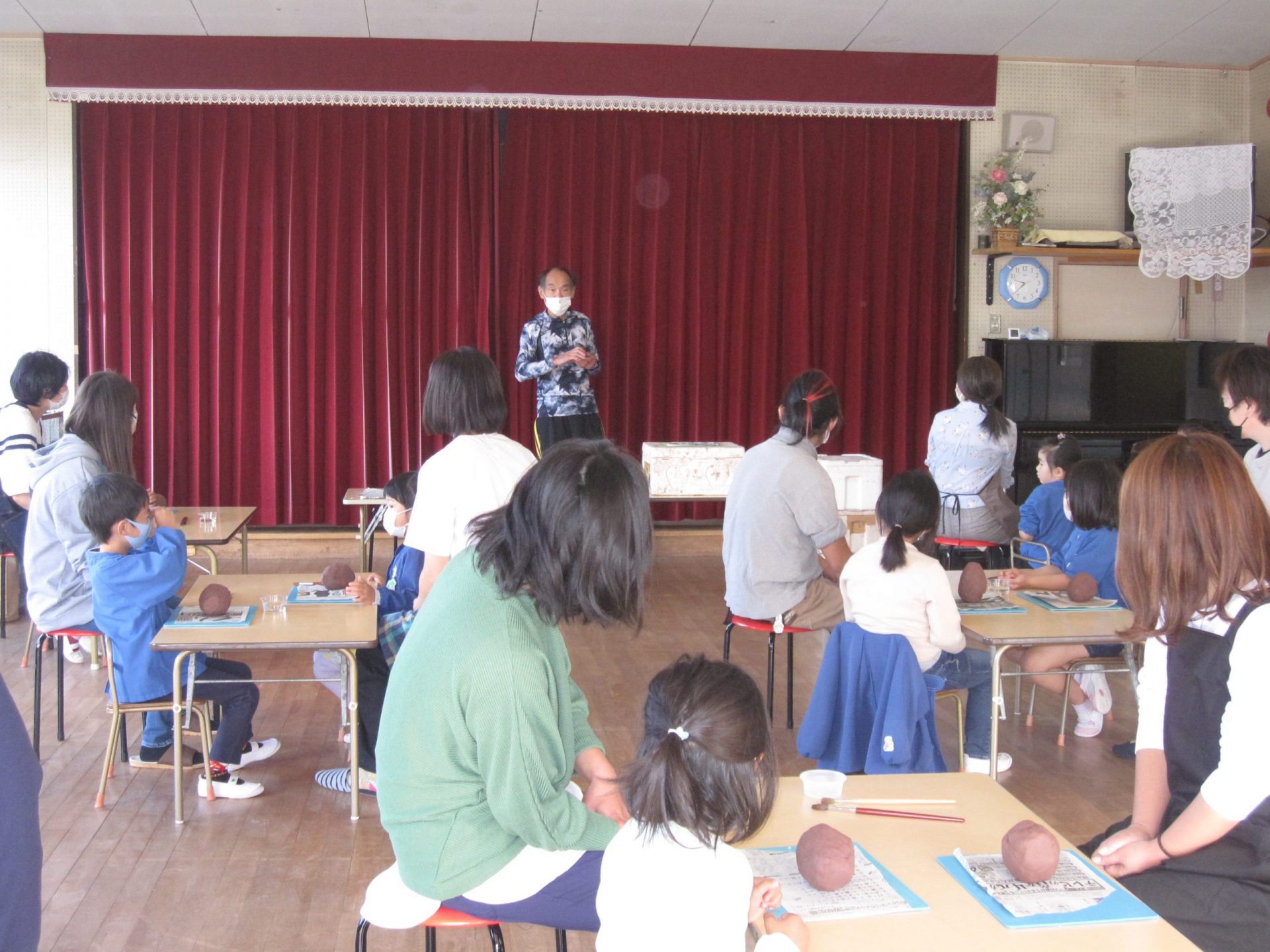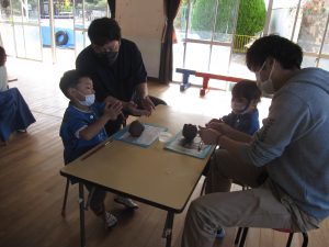 感染症の影響で2年ぶりの陶芸教室の開催となりましたが、親子で力を合わせて一つのものを作る良い経験になりました。「これくらい?」「名前はひらがながいい!」「お花をいれて飾ろうね」自然と会話も増え、楽しそうな声が聞かれました。焼き上がって手元に届くのはまだ先ですが、子どもたちは「早く来ないかな~」と楽しみにしています。卒園後もお家でふと見たときに一緒に作った楽しさや会話も思い出してもらえればいいなあと思います。