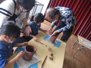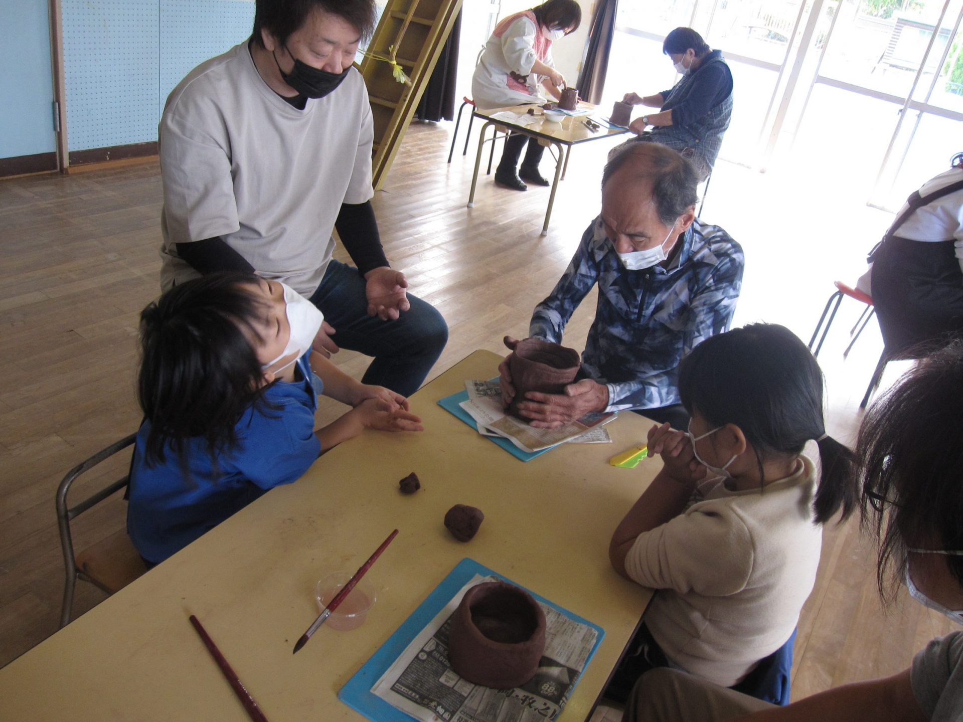 内山にある荒船焼窯元の大島さんを講師にお呼びして、年長組の親子で陶芸体験をしました。