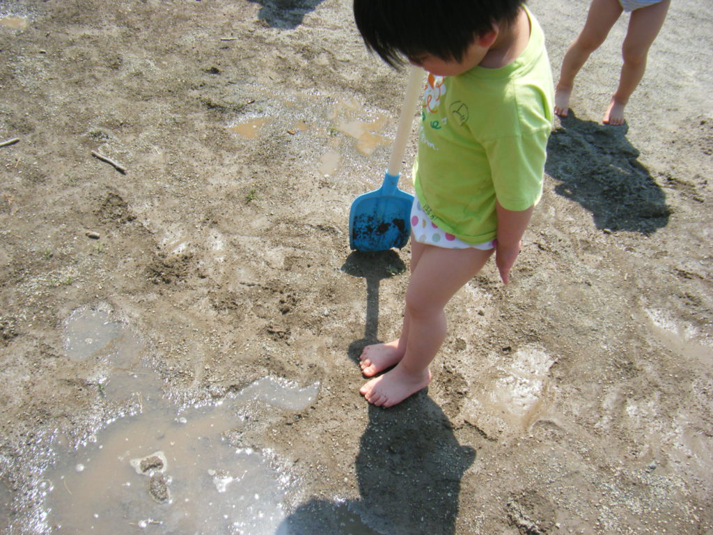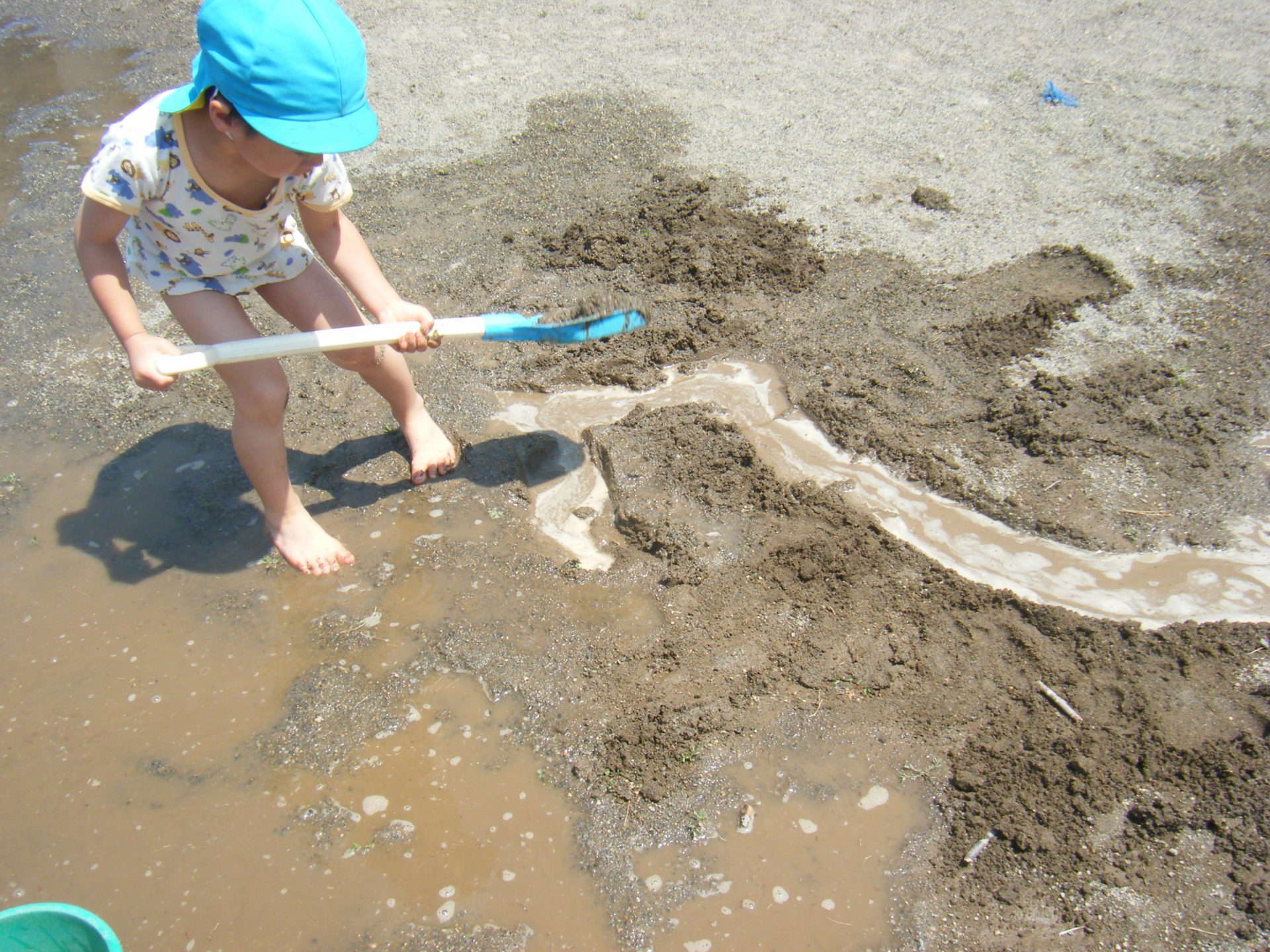 これからどろんこ遊びを通して、水の温度、泥の質感などを肌で感じたり、全身を使って伸び伸びと楽しんでほしいと思います。 そして、見たこと、感じたことなど子どもたちから自然と出てくる言葉や思いを受け止めながら遊びを盛り上げていきたいと思います。
