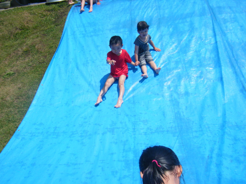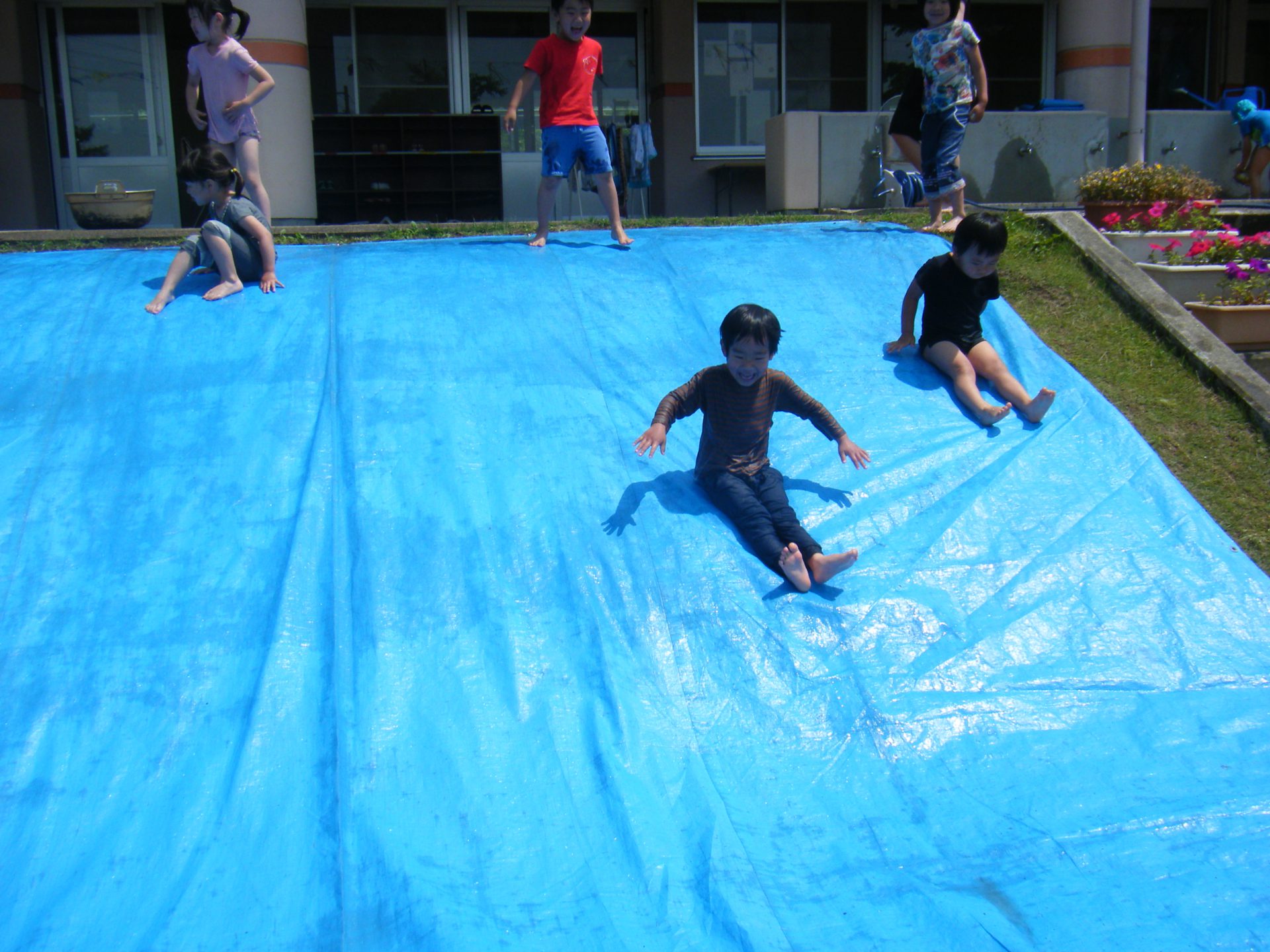 大きな大きなウォータースライダーにドキドキの年少さん。 「怖そうだなぁ。でもやってみたいなぁ。。」と心の声が聞こえてきそうな眼差しで、お兄さんお姉さんの遊ぶ姿を見つめていました。 お友だちや保育士に誘われ、すべってみると、そのスピード感や爽快感がやみつきになっていました♪