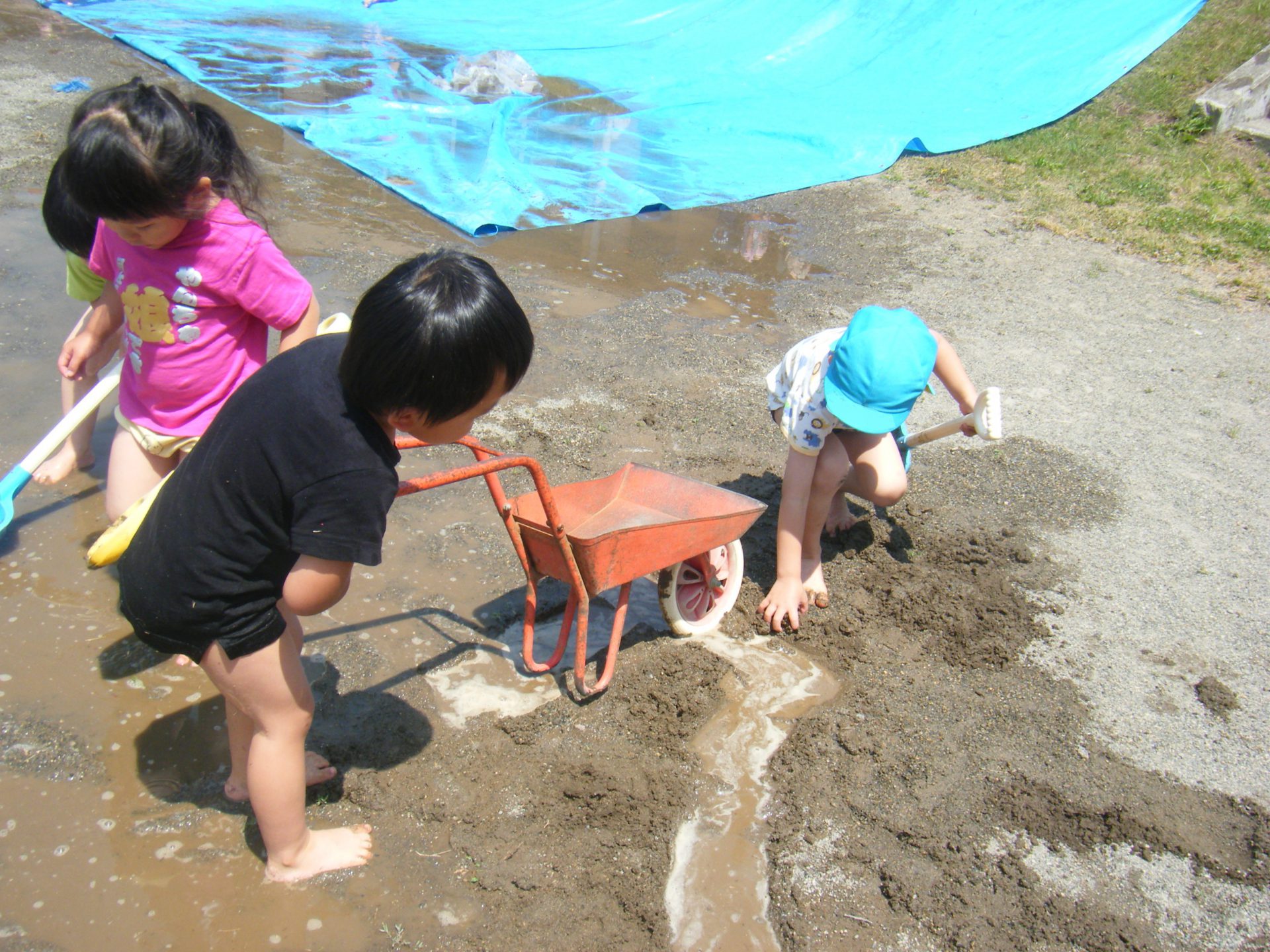 何回もスライダーで遊ぶ子、ホースやじょうろなどを使ってお水で遊ぶ子、泥の中に入って遊ぶ子、川を作って遊ぶ子・・・ それぞれ好きなあそびを見つけて楽しむ姿が見られました。 遊び終わり、お着替えをしていると「またやりたいねぇ~!」「楽しかったねぇ~!」と友だち同士で話をしていました。