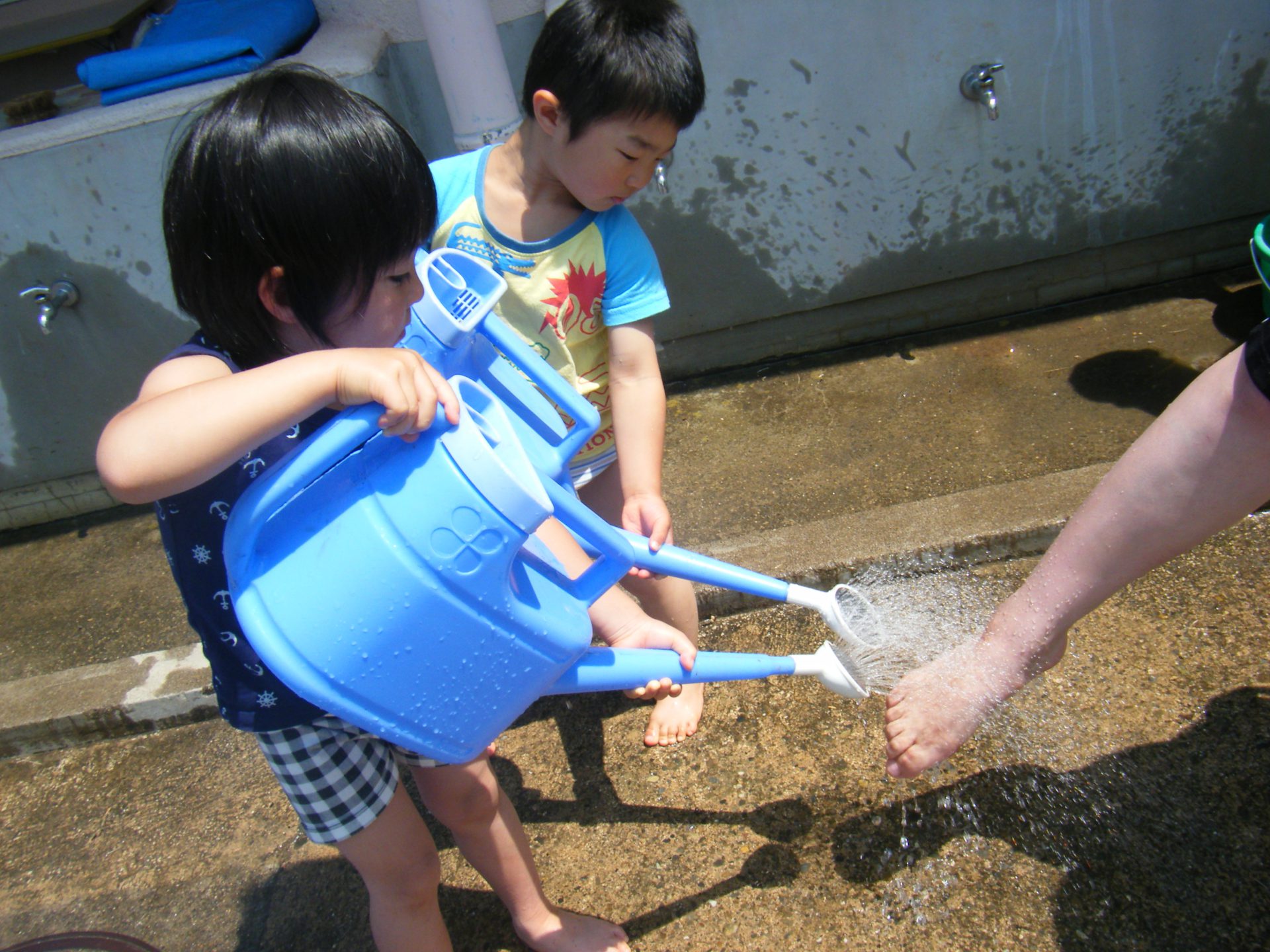 「先生〜!足洗ってあげる〜!」お水をたっぷり入れてじょうろでたくさんかけてくれました。この後、プランターのお花にもお水をたくさんあげていました。