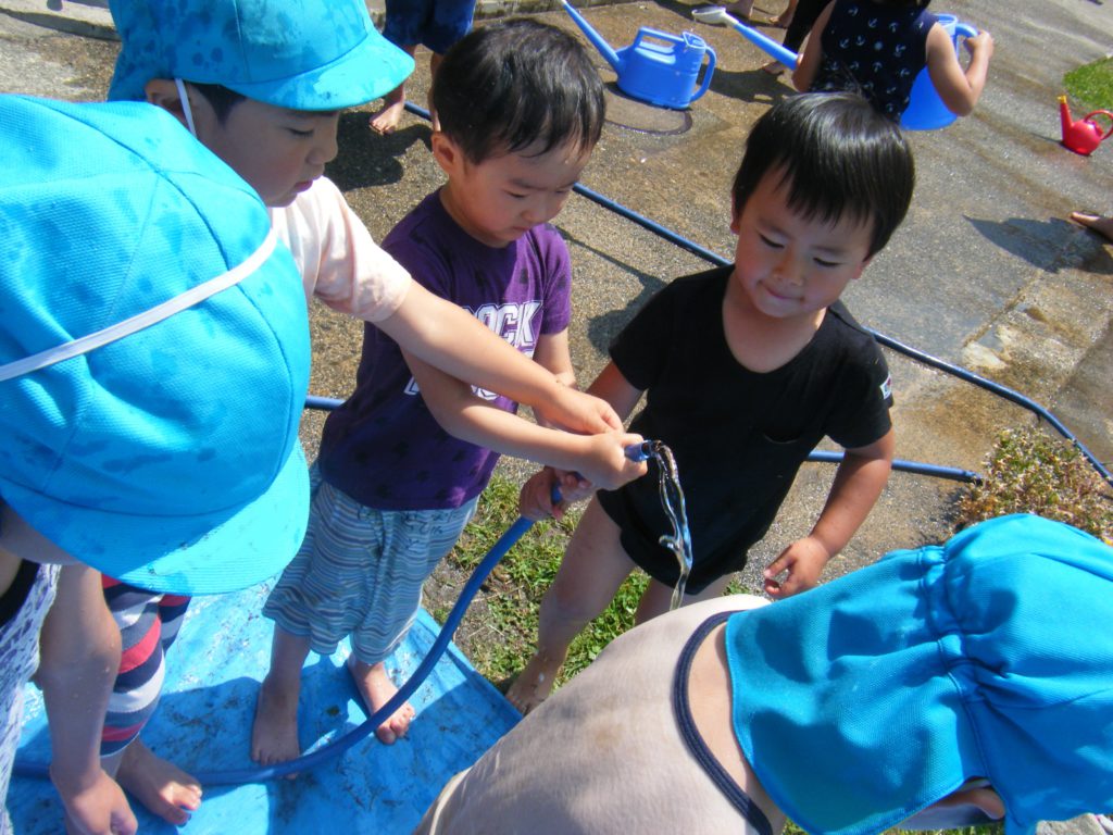 ホースは大人気!「こうやって持つといっぱい水が出るんだよ!」と年長さんに教えてもらったり、「代わって〜!」「いいよ〜!」とお友だちと交代しながら水を掛け合い遊んでいました。