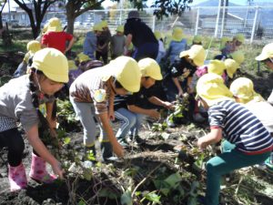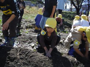 という保育士の問いかけに「さつまいも!!」と大きな声で答える子どもたち。