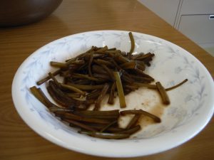 「芋茎(ずいき)って言うんだよ」と伝え、先に芋茎を取っていた年少さんをお手伝い。