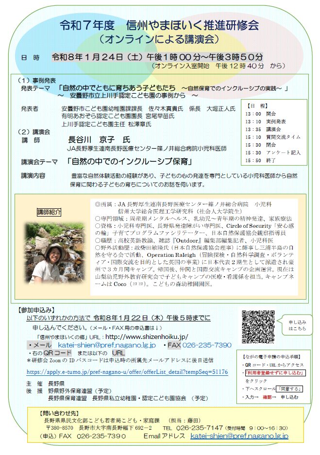 信州型自然保育の充実を図るため、認定園や認定を受けようとする園の様々な園種の保育者が集い、自然保育の専門の方のお話を聞きし、学び合い交流する研修を行います。自然保育の理解がより深まります。