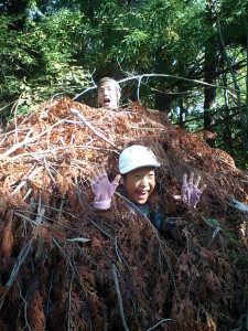 人間にとって自分だけの空間というのはとても大切なものです。 そこで今回は、裏山にひみつ基地を創って遊びます。ひみつ基地を利用してどんな事が出来るかな? (本を読んだり、お友達と一緒に入ってお話したり、宝物を隠しておいたり、お昼寝したりなどなど)