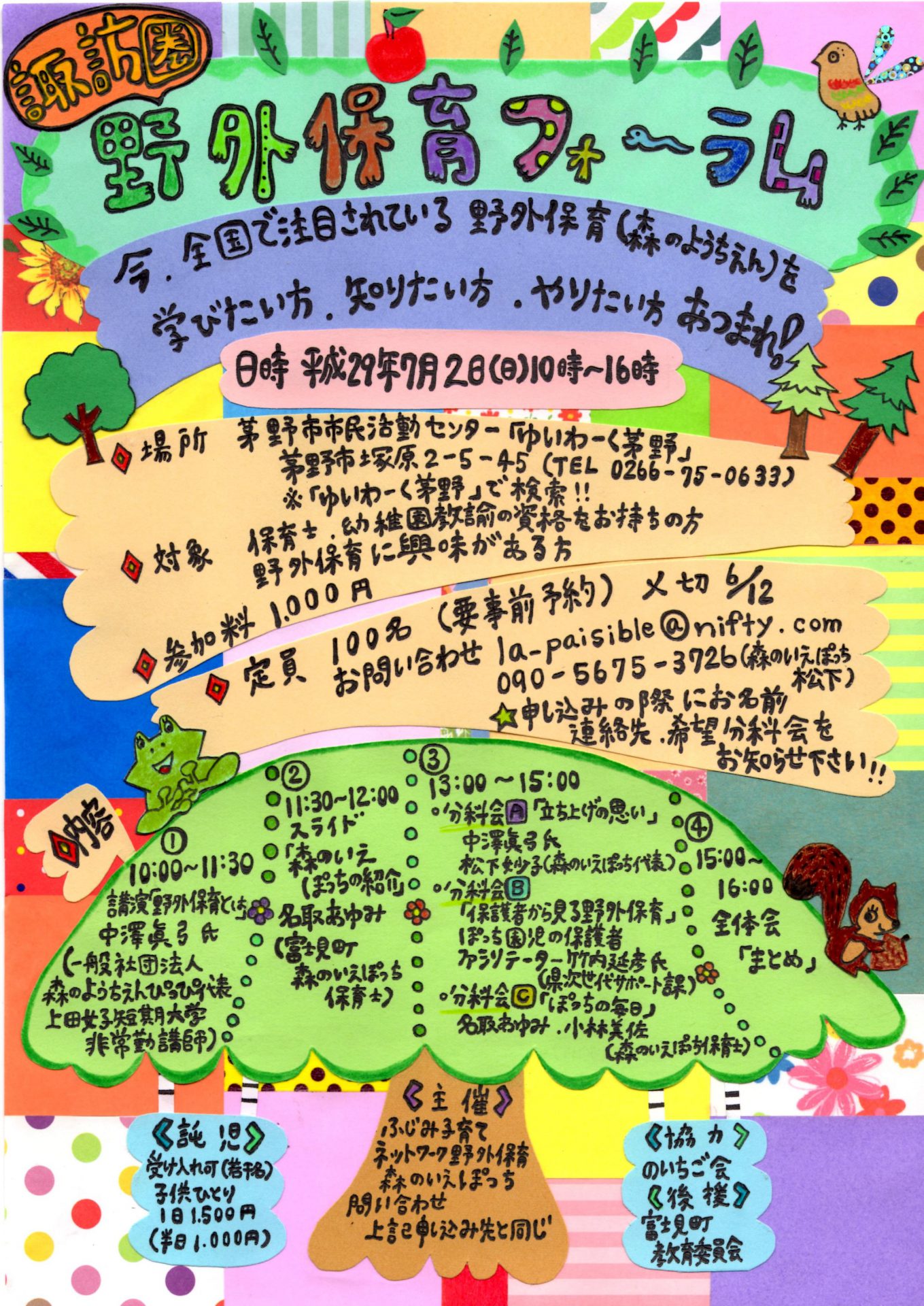 諏訪圏で初めての野外保育(森のようちえん)について学ぶフォーラムを開催します。信州やまほいく特化型園である森のようちえんぴっぴ代表・上田女子短期大学非常勤講師 中澤眞弓さんのよる講演、森のいえぽっちの保育紹介、保護者からみた野外保育など盛りだくさんです。保育者はもちろん、子育て中の保護者も興味のある方はぜひご参加ください。締切は12日ですが、まだまだ余裕がありますので、お知り合いもぜひお誘いください。