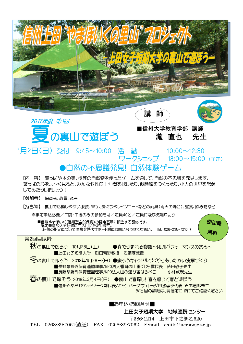 信州上田”やまほいくの里山”プロジェクト ~上田女子短期大学の裏山で遊ぼう~ ◆ 7/2(日) 第1回「夏の裏山で遊ぼう」開催! ◆