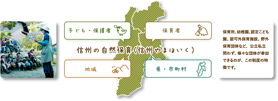 自然保育の良さを多くの方に知ってほしい。子どもたちと一緒に様々な体験活動に取り組んでほしい。 そんな願いを実現するため、自然保育の価値を県が率先して評価しようとこの制度を創設しました。 制度を通じて、自然保育の社会的認知や信頼性が向上し、県内の保育や幼児教育に携わる方々が積極的に自然保育に取り組むことができたり、保護者が安心して子どもを託すことができるよう、自然保育環境の充実を目指します。 自然保育についての学びあいや交流の場が県内各地に広がることを期待し、子ども、保護者、保育者、地域、市町村、県がみんなで参加し、みんなで創っていくのが信州の自然保育(信州やまほいく)です。