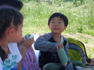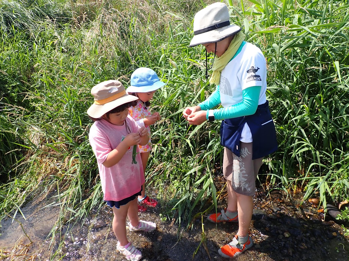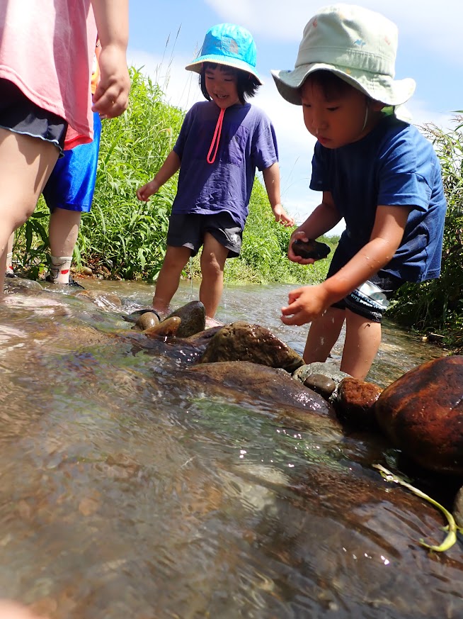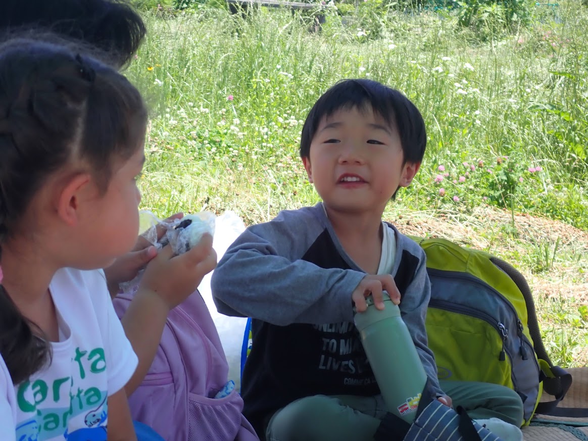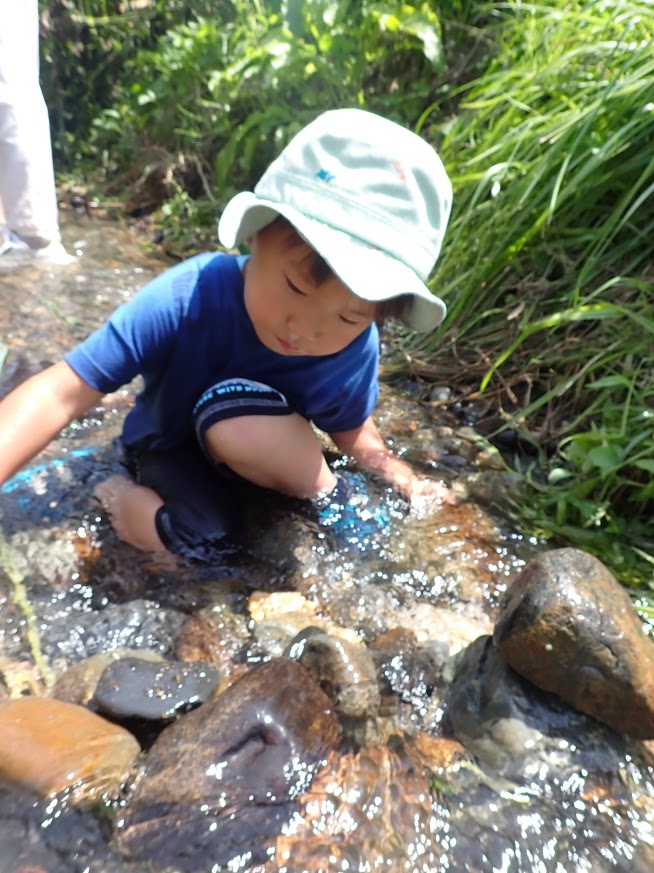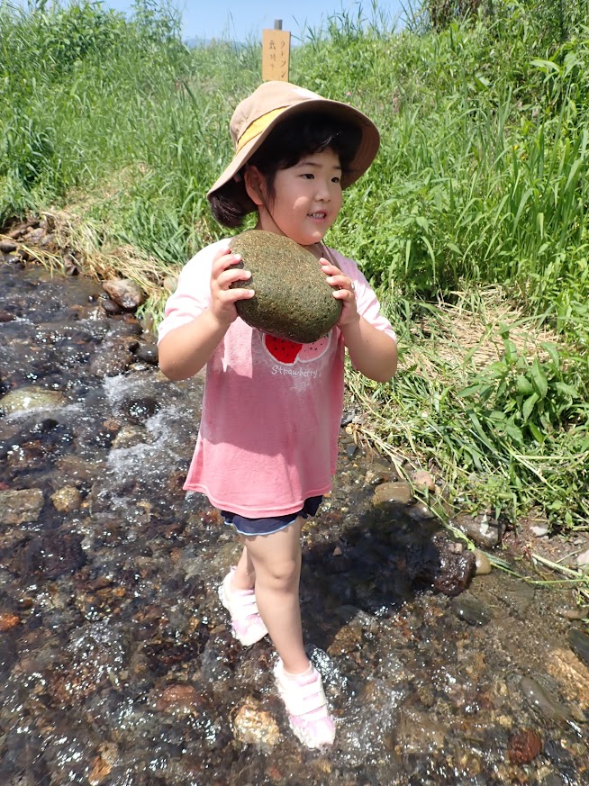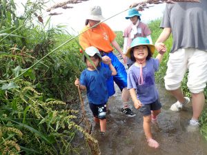 人の手で、農薬を使わず、面倒な事と感じることを丁寧に行って、食べる事へつなげることの労力は想像を越えます。暑い日も年長児が中心となって田の草取りをおこないます。(年中少児はもっぱら田んぼの中の水生生物に夢中ですが・・・(笑))