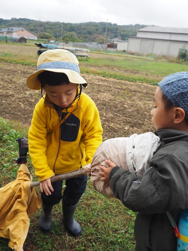 十日夜の数日前に、すでに稲刈りの終わった田んぼから園へ子どもたちが案山子を連れて帰って来ました。
