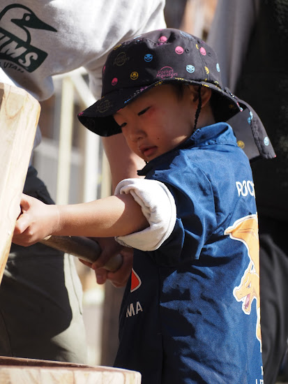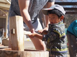 大人にサポートしてもらいながら真剣な表情で杵を力一杯持ち上げ、お餅を搗きました。