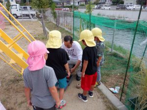 園の近くをお散歩中、地域の方と出会い挨拶をして「何してるのー?」と質問する子どもたち。