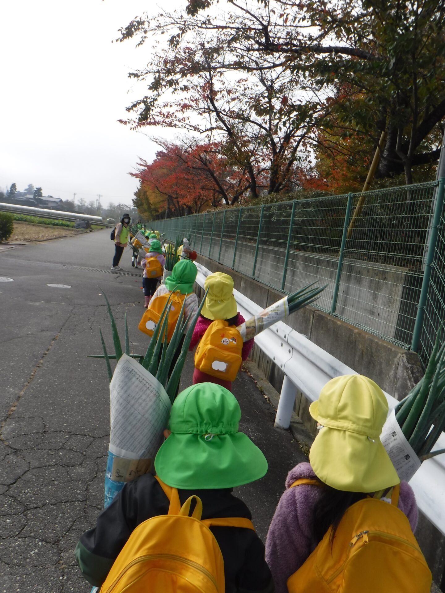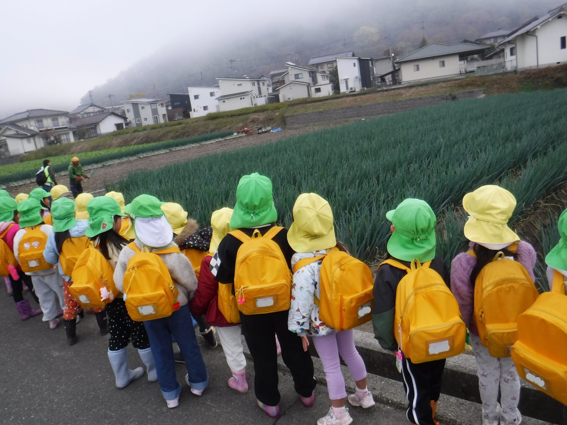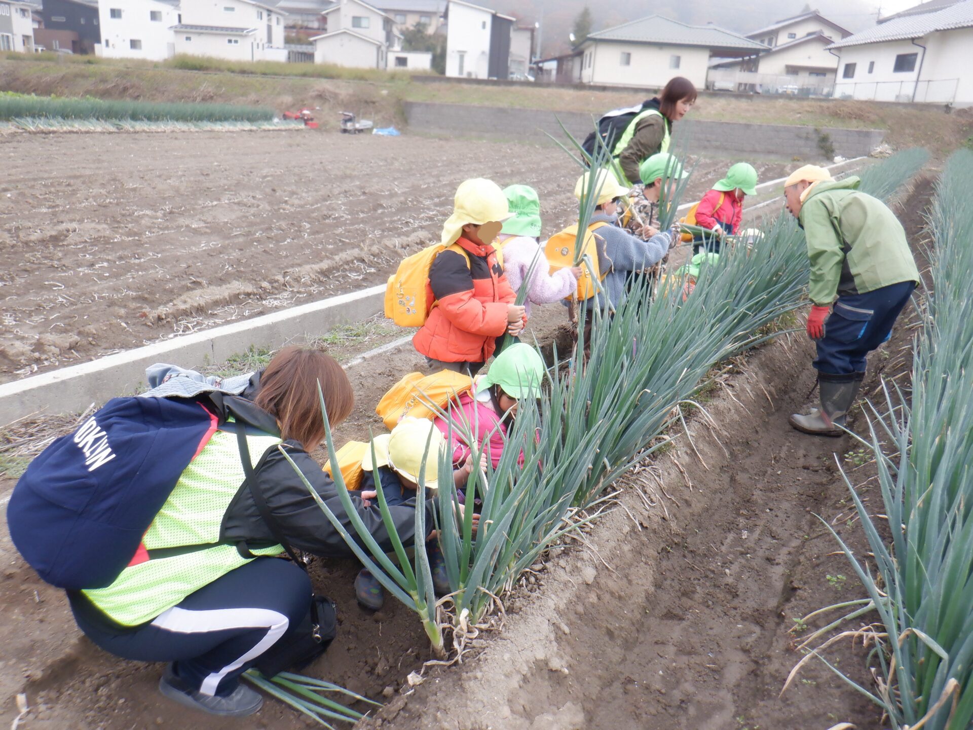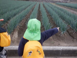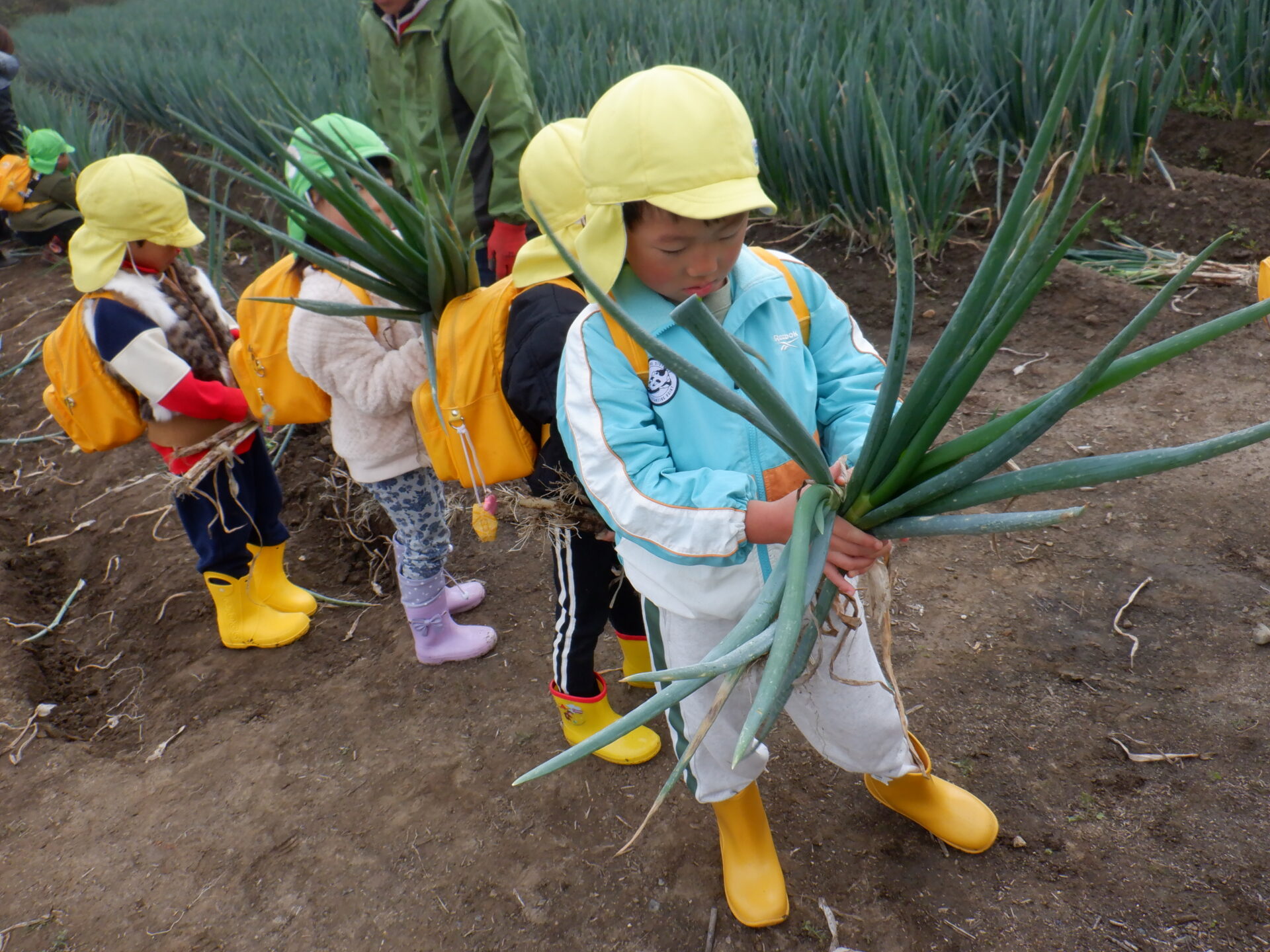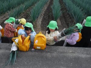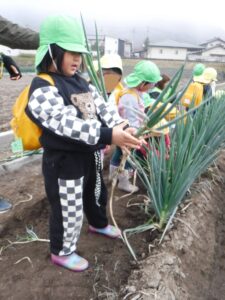 地域の方と素敵なご縁があり、ネギの収穫体験をすることができました。ほとんどの園児がネギの収穫をすることが初めてでしたが、地域の方に抜き方を教えてもらい真剣な表情で挑戦していました。園や家庭ではなかなかできない体験を通して地域の方との交流や季節の野菜に興味をもって過ごしていけたらいいなと思います。