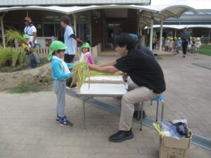 「あ〜疲れた〜」「お米を作るって大変だな〜」というつぶやきも聞こえ、支えて頂いている地域の方たちへの尊敬や感謝の気持ちも持てた子ども達。そして、無事稲刈りができて、達成感を感じていました。