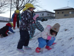 北アルプスが間近に見え、田畑に囲まれた自然豊かな認定こども園です。散歩や遠足に出かけ色々な地域の自然(田畑での遊び、どんぐり等木の実ひろい、林の中でのかくれんぼ、追いかけっこ)に触れることができます。