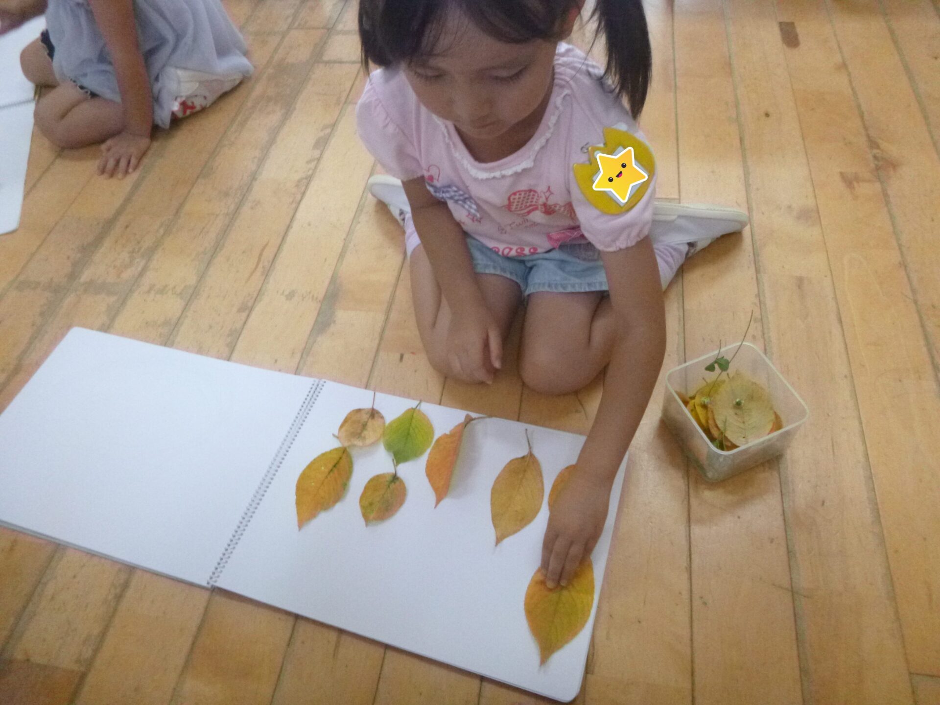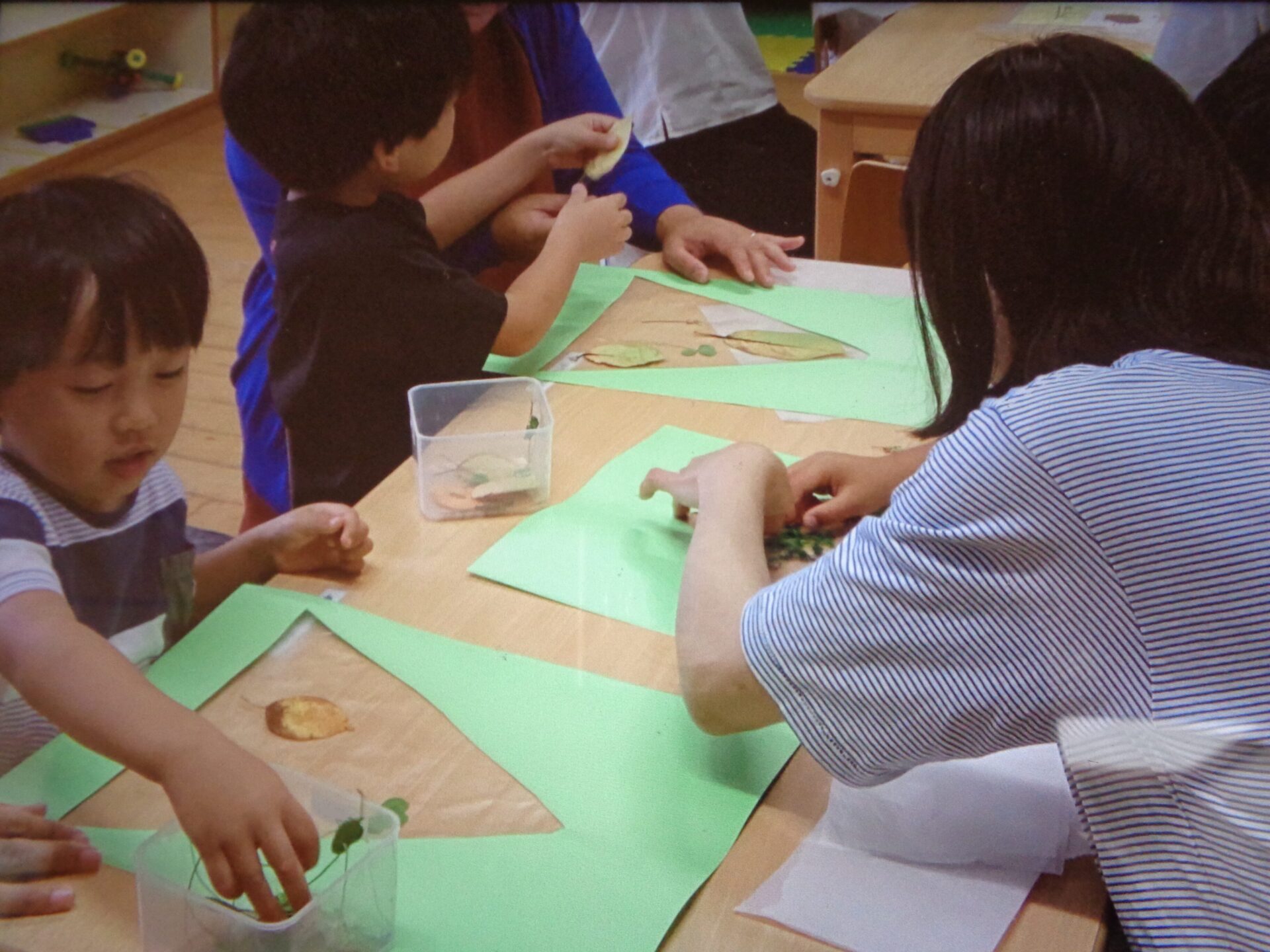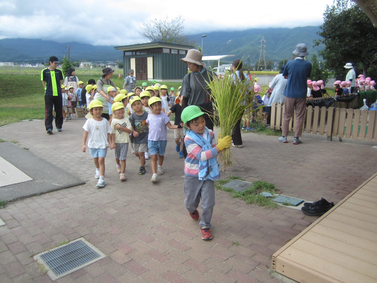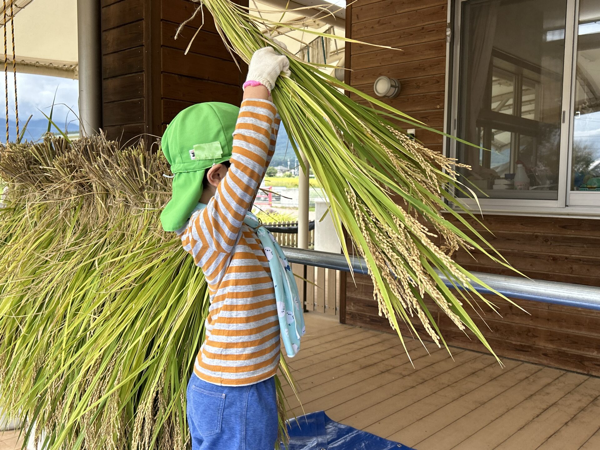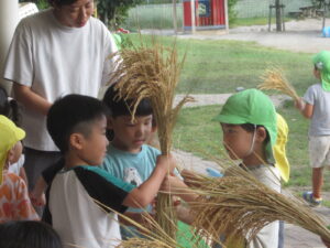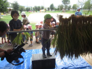 干した稲を室内に運ぶ時も、年長さんは年中・年少さんの部屋の前に行って稲を見せてあげていました。