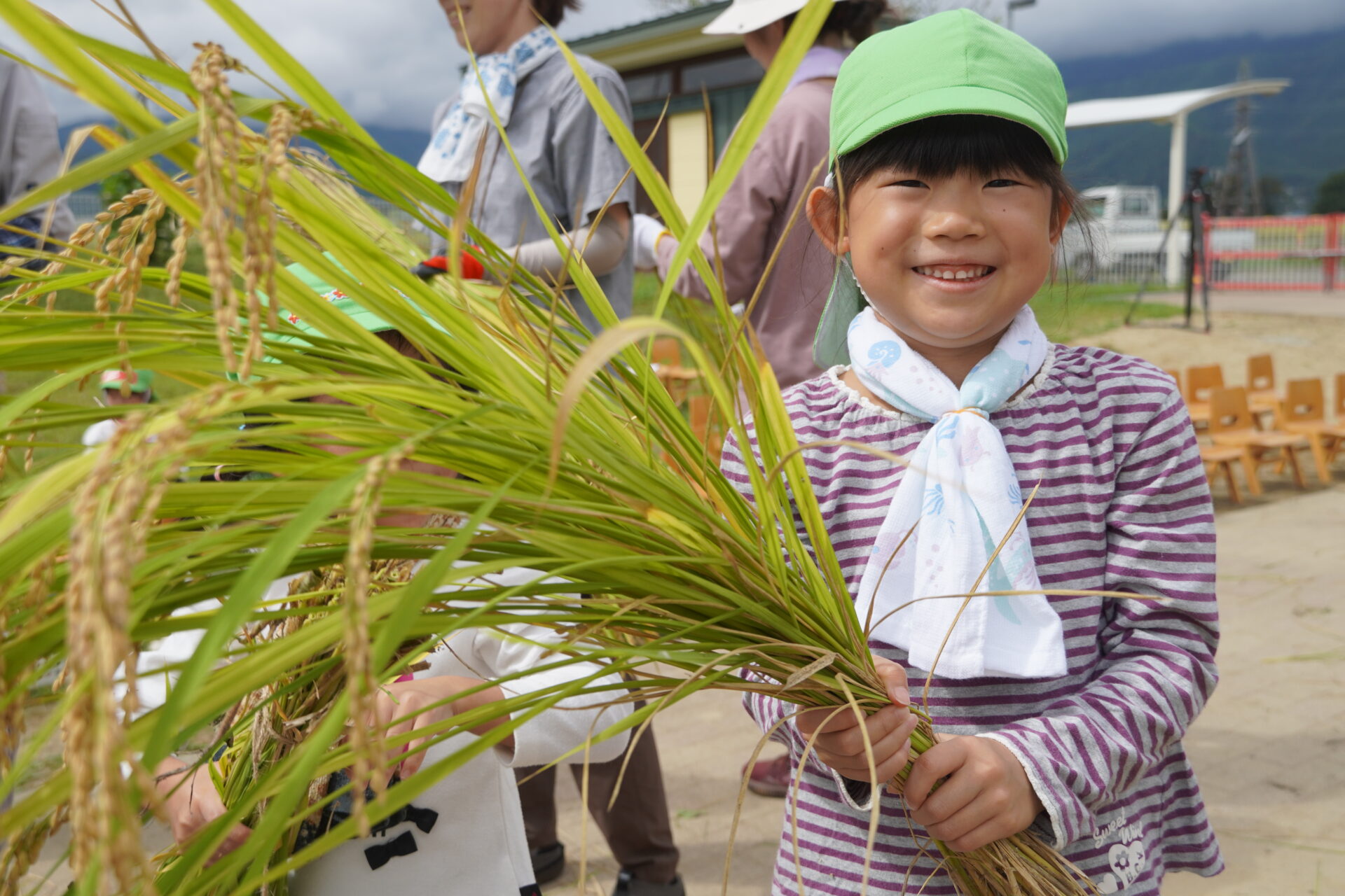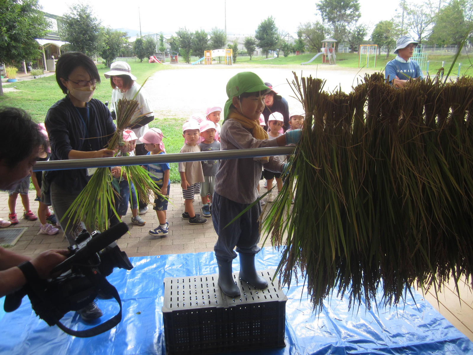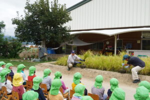 稲刈りが始まると、年中さんや年少さんも田んぼの周りに集まってきて、年長さんの稲刈りの様子を憧れの眼差しで見ていました。