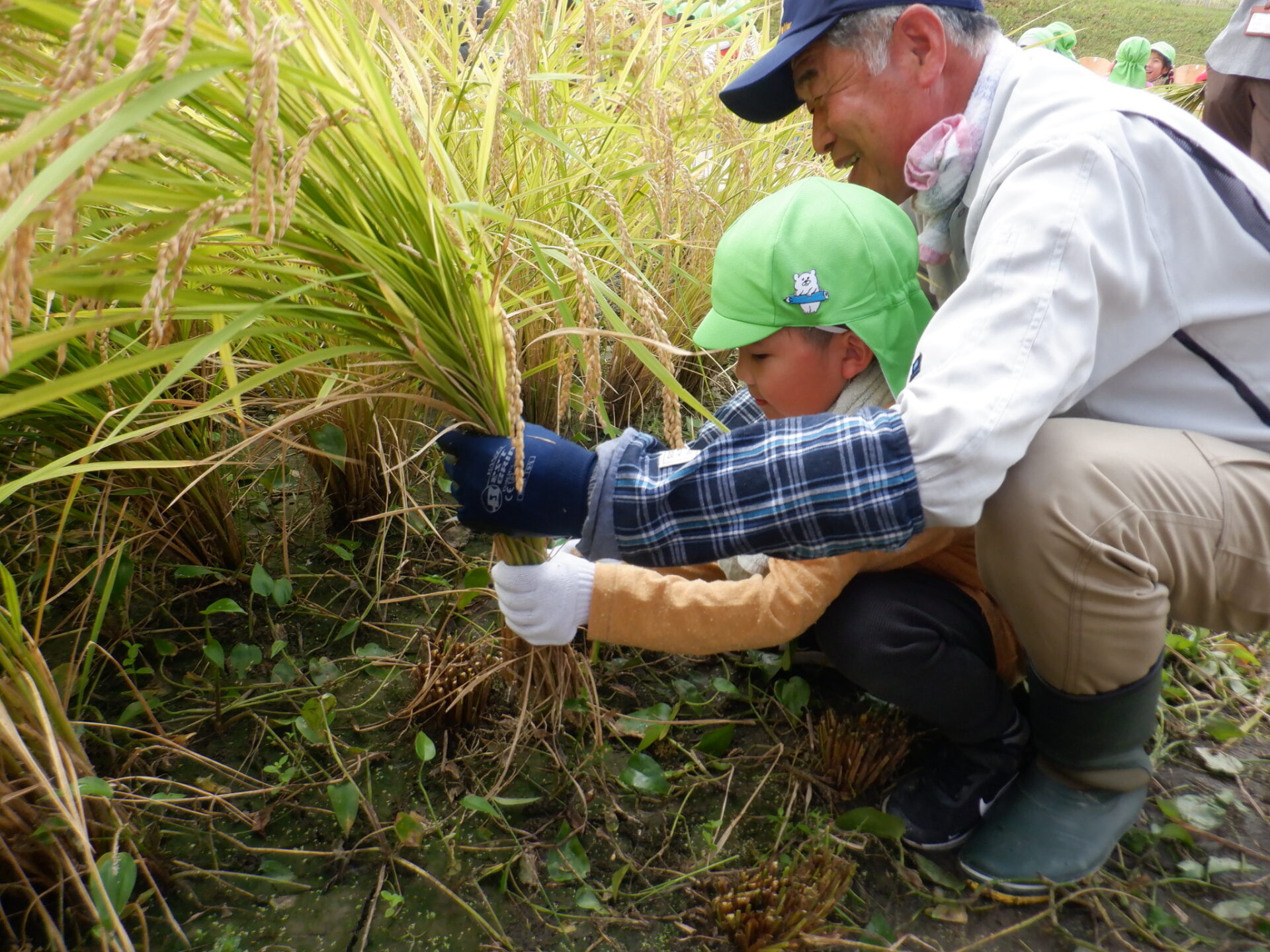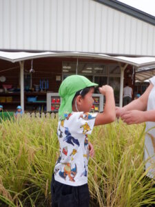 「今年は豊作!」「収穫もちょうどいい時期!」とお墨付きをもらい、大喜びでお米博士や子ども支援課の方と一緒に鎌を使って稲刈りに挑戦。