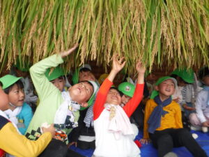 「あ〜疲れた〜」「お米を作るって大変だな〜」というつぶやきも聞こえ、支えて頂いている地域の方たちへの尊敬や感謝の気持ちも持てた子ども達。そして、無事稲刈りができて、達成感を感じていました。