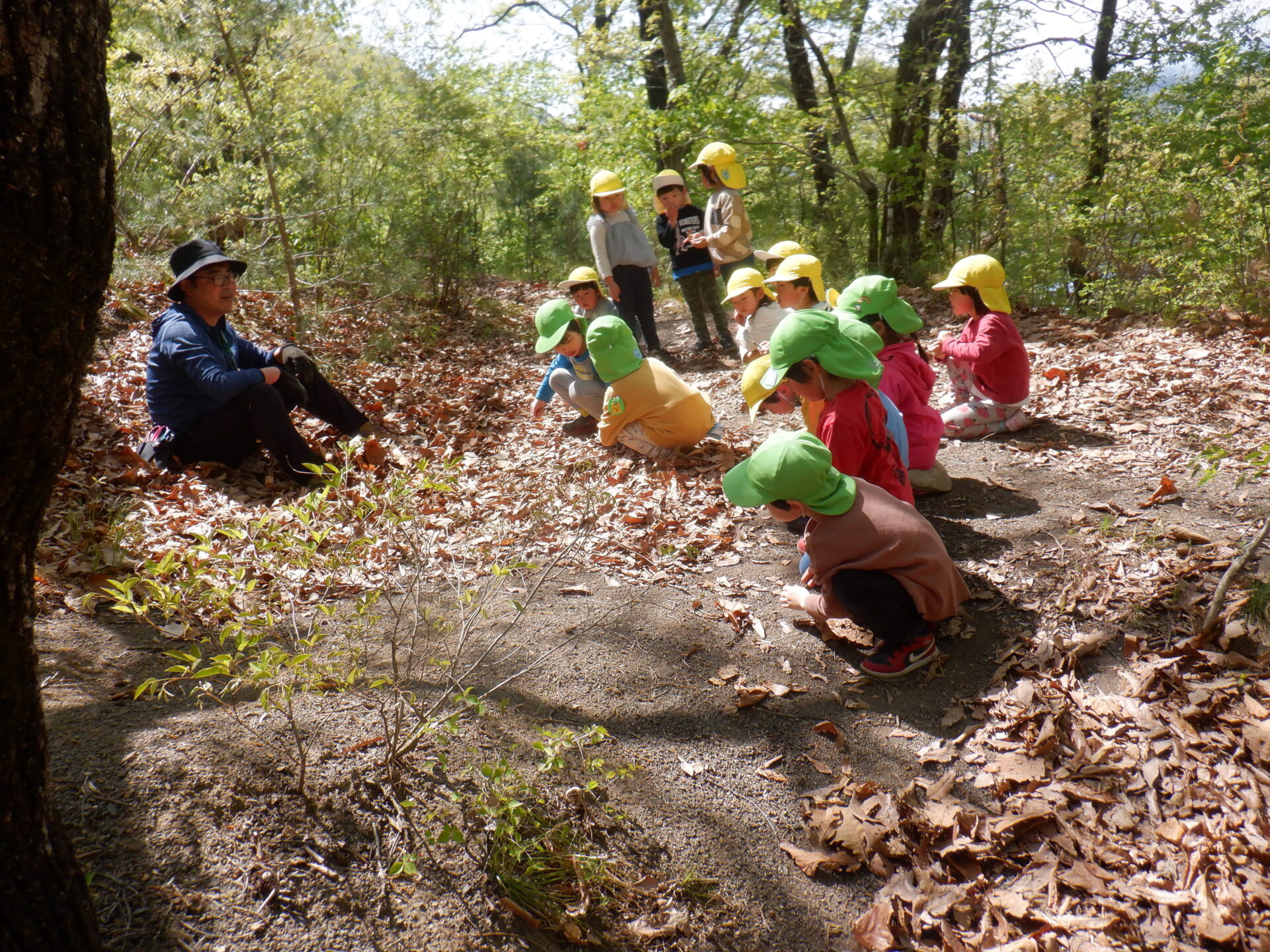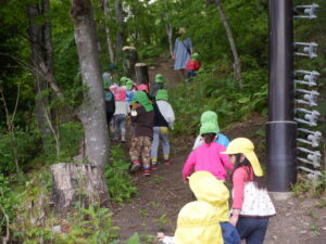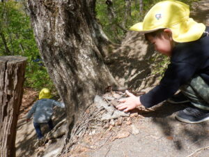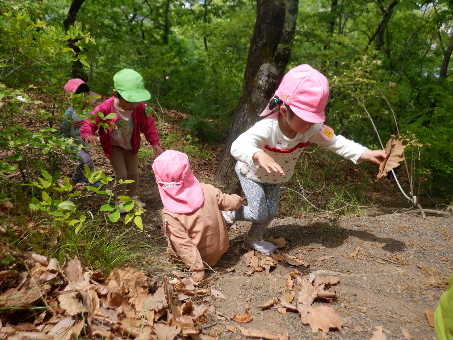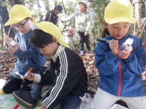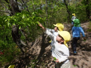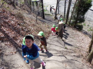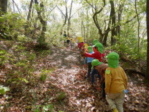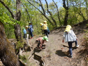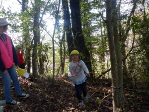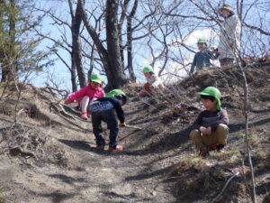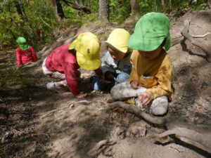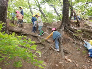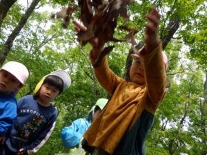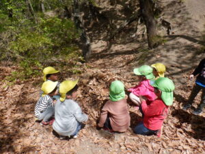 どんぐりがたくさん落ちいている上川手の山。「どんぐりたくさん拾いたいな!」と、わくわくしながら山に入っていきました。