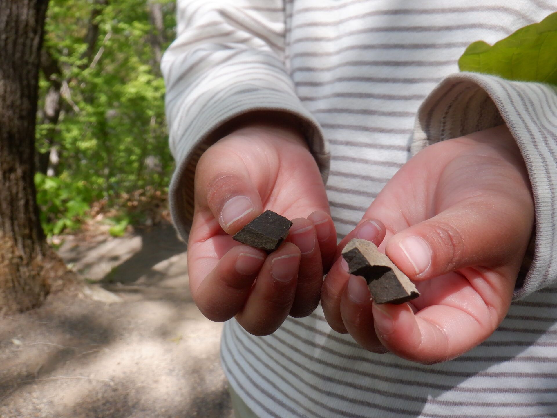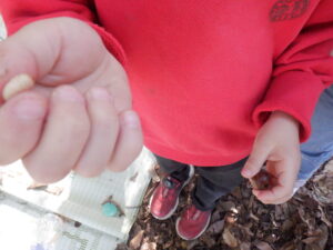 「どんぐり虫を出してるの!」と、どんぐりの中に住んでいるどんぐり虫を木の棒で叩いて探し出したり、どんぐりを割って夢中で探しました。