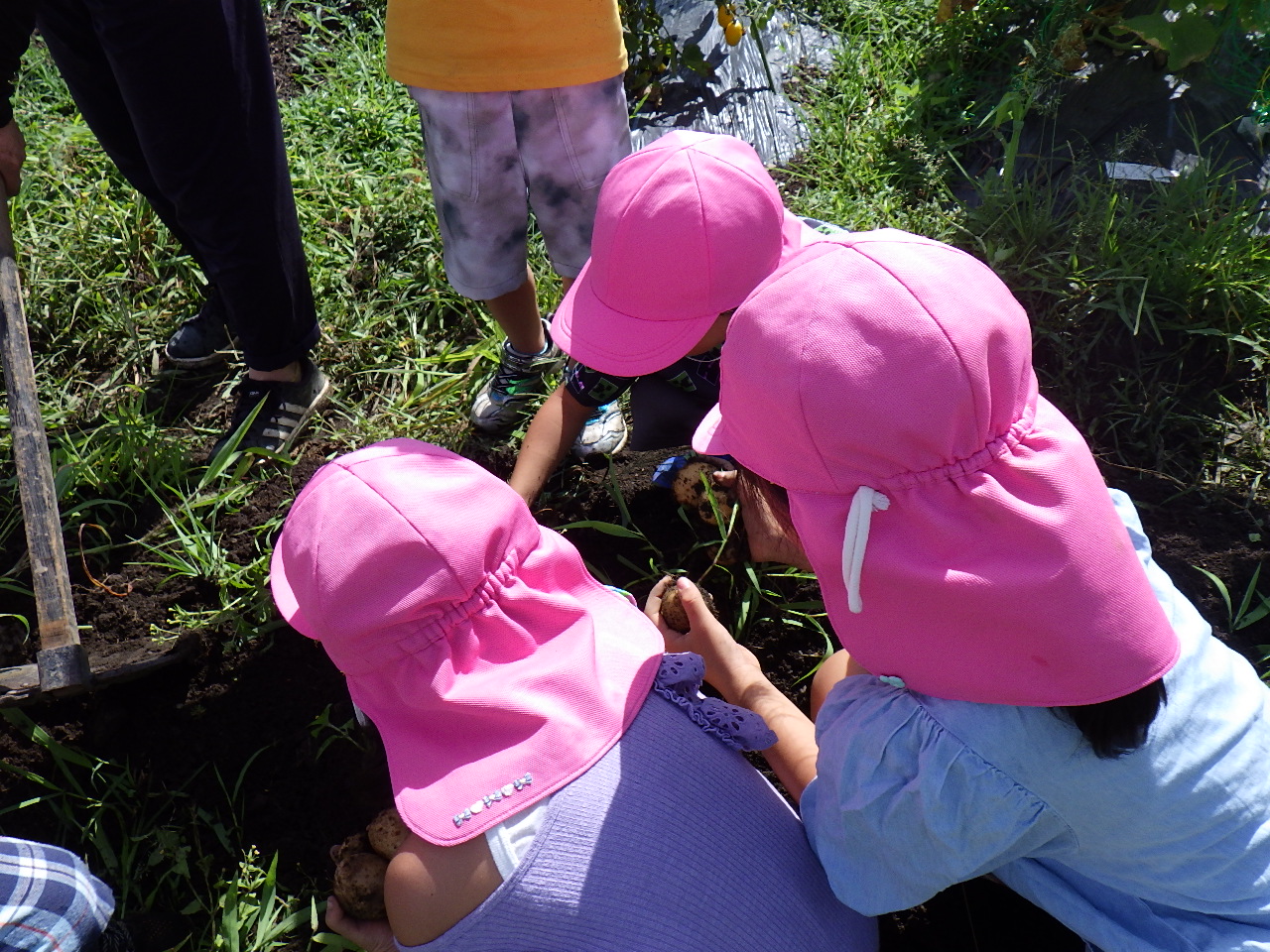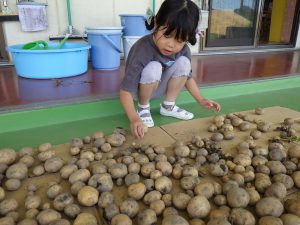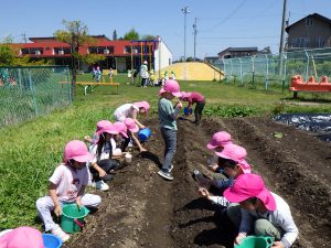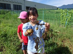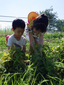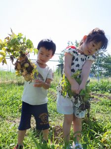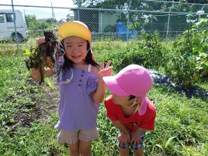 園の敷地内に畑もあるので、年齢ごと毎年多くの野菜作りをし、収穫した野菜を給食の食材として調理してもらったり、時には自分たちでクッキング保育をして自分たちで育てたものを食べる喜びを味わっています。