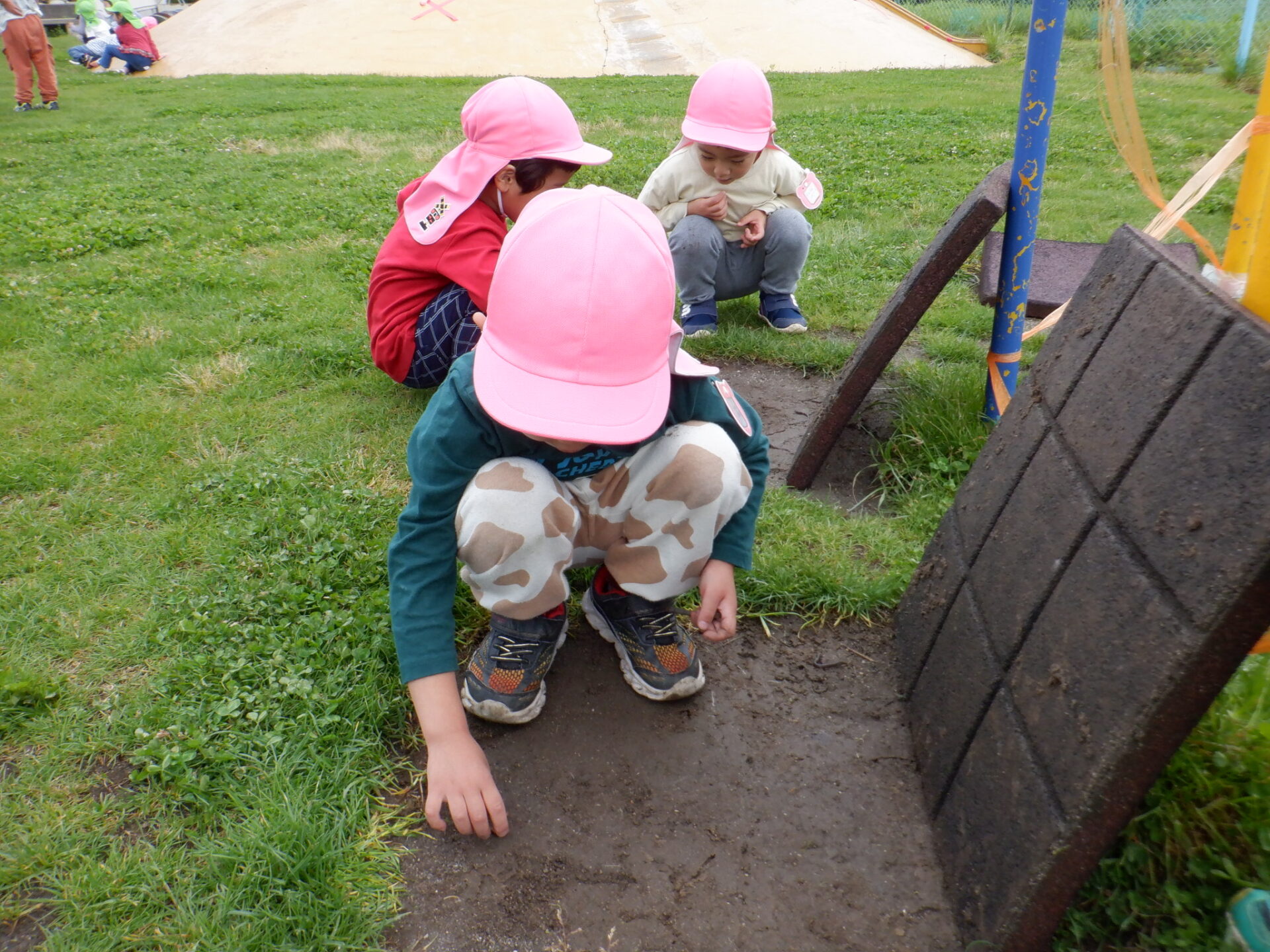 虫探しに夢中なひよこぐみさん。「だんだーん!(だんごむし)」と呼びながら、コンクリート沿いを探します。