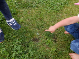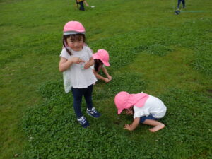 春から虫探しを楽しんでいた子どもたちは、どういう所に虫が隠れているのか知っていて、コンクリートや壁側の芝生を探り、虫たちを探します。