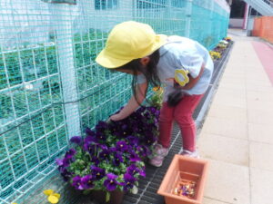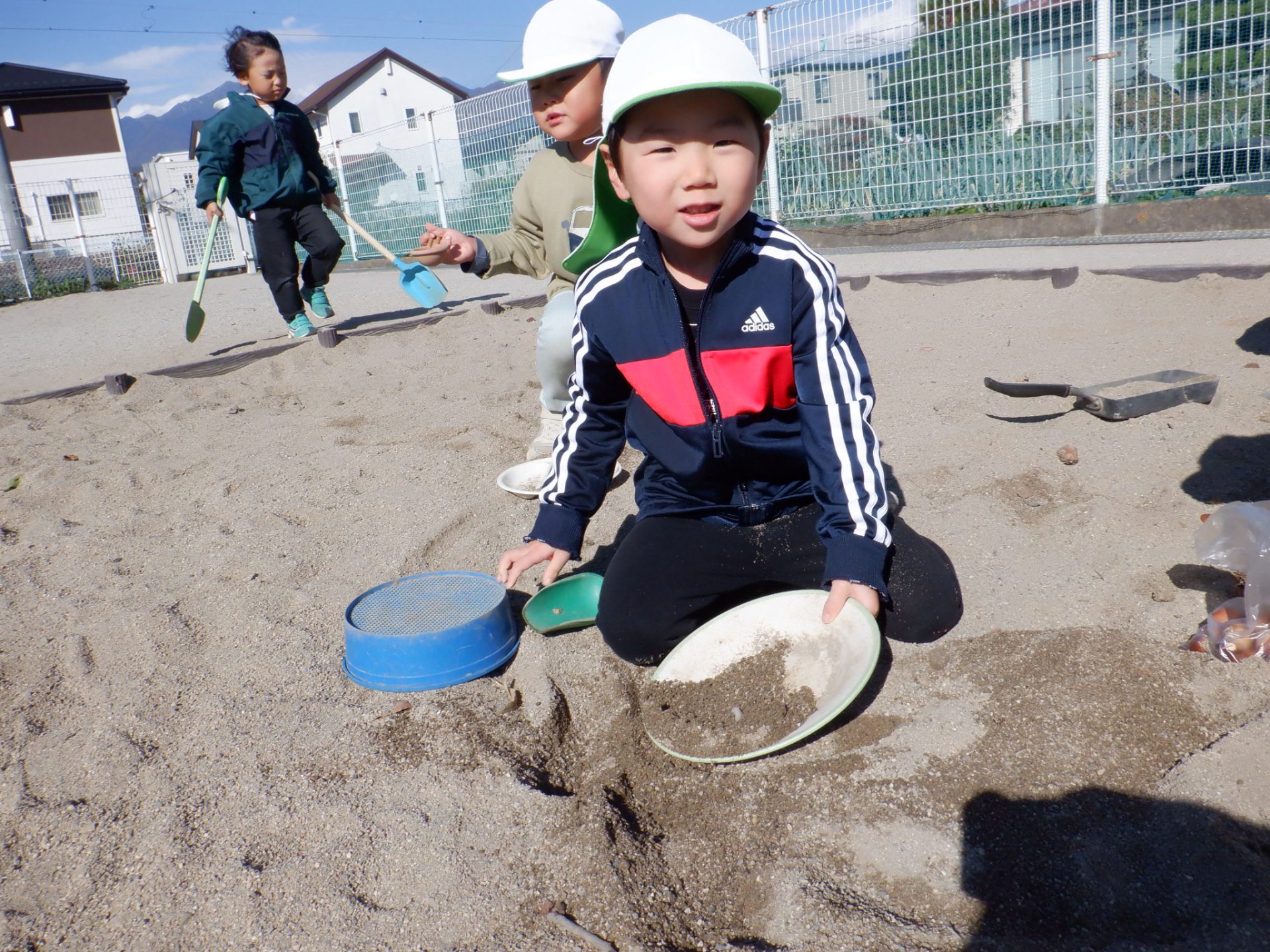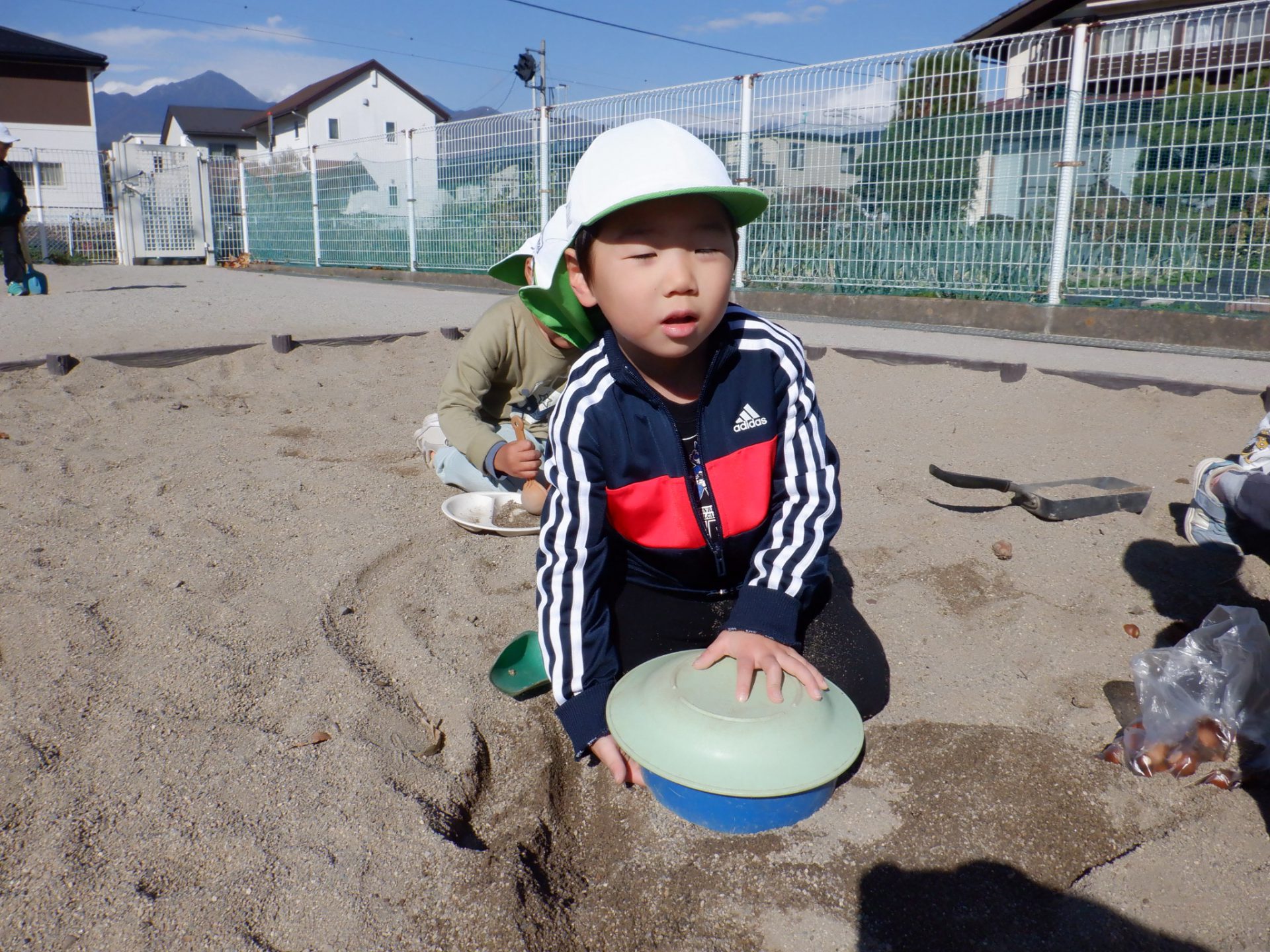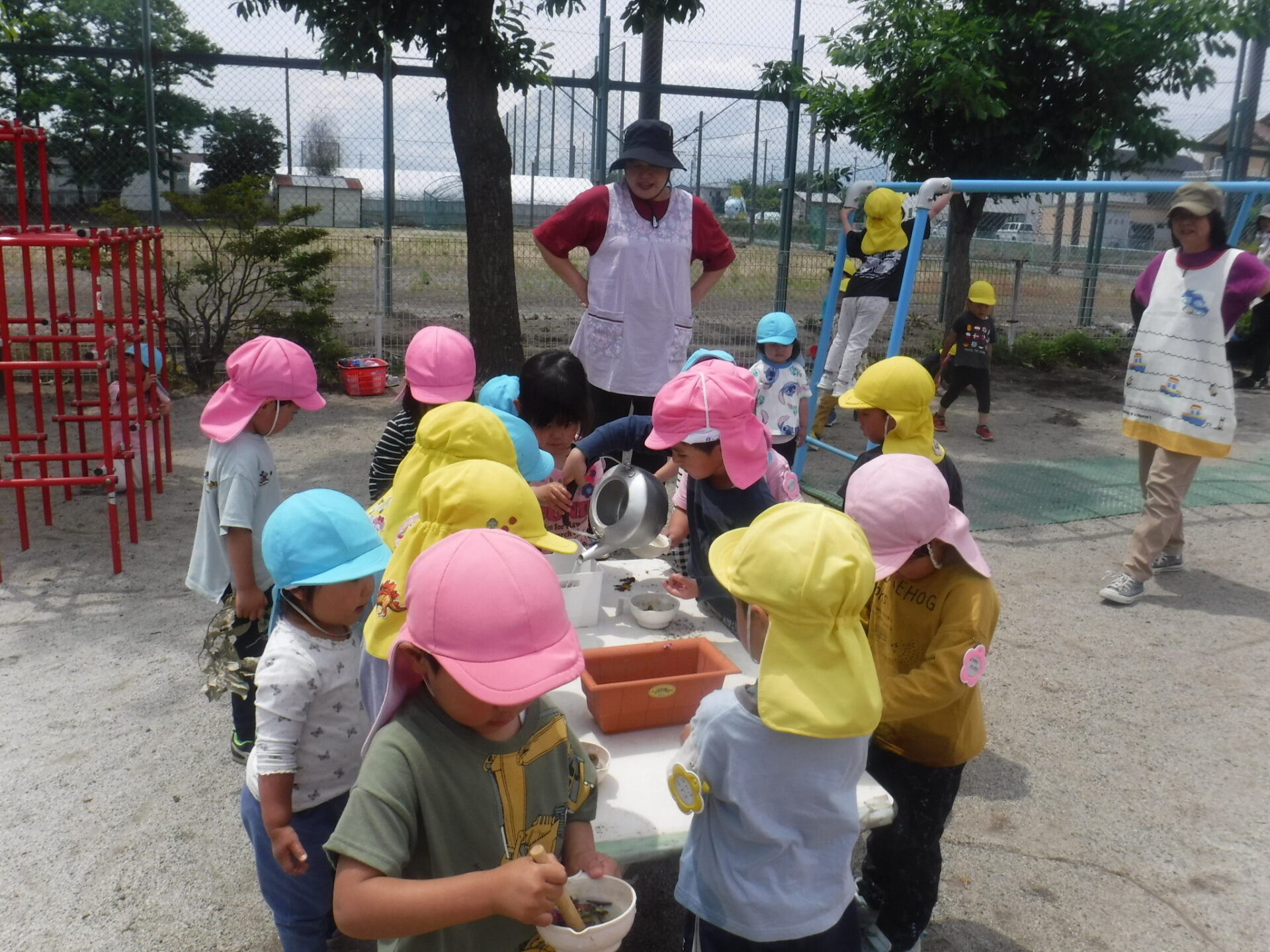 当園は、市街地にあり2階建ての園舎からは、常念岳をはじめ山々が見渡すこともでき季節の移り変わりを感じられます。子ども達のやってみたいという気持ちを大切に、戸外遊びの時間を十分にとり、園庭の木や草花で遊んだり、花壇を利用して野菜を植えたりして身近な自然に興味や関心をもてるようにしています。また、園庭では水や泥遊びのできるコーナーを作り、遊びを楽しんでいます。