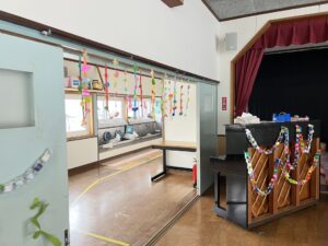 お別れ会の前日、ほし組さん(3歳児)つき組さん(4歳児)はこの日のために作ってきたものを遊戯室いっぱいに飾り、準備をしてくれました。