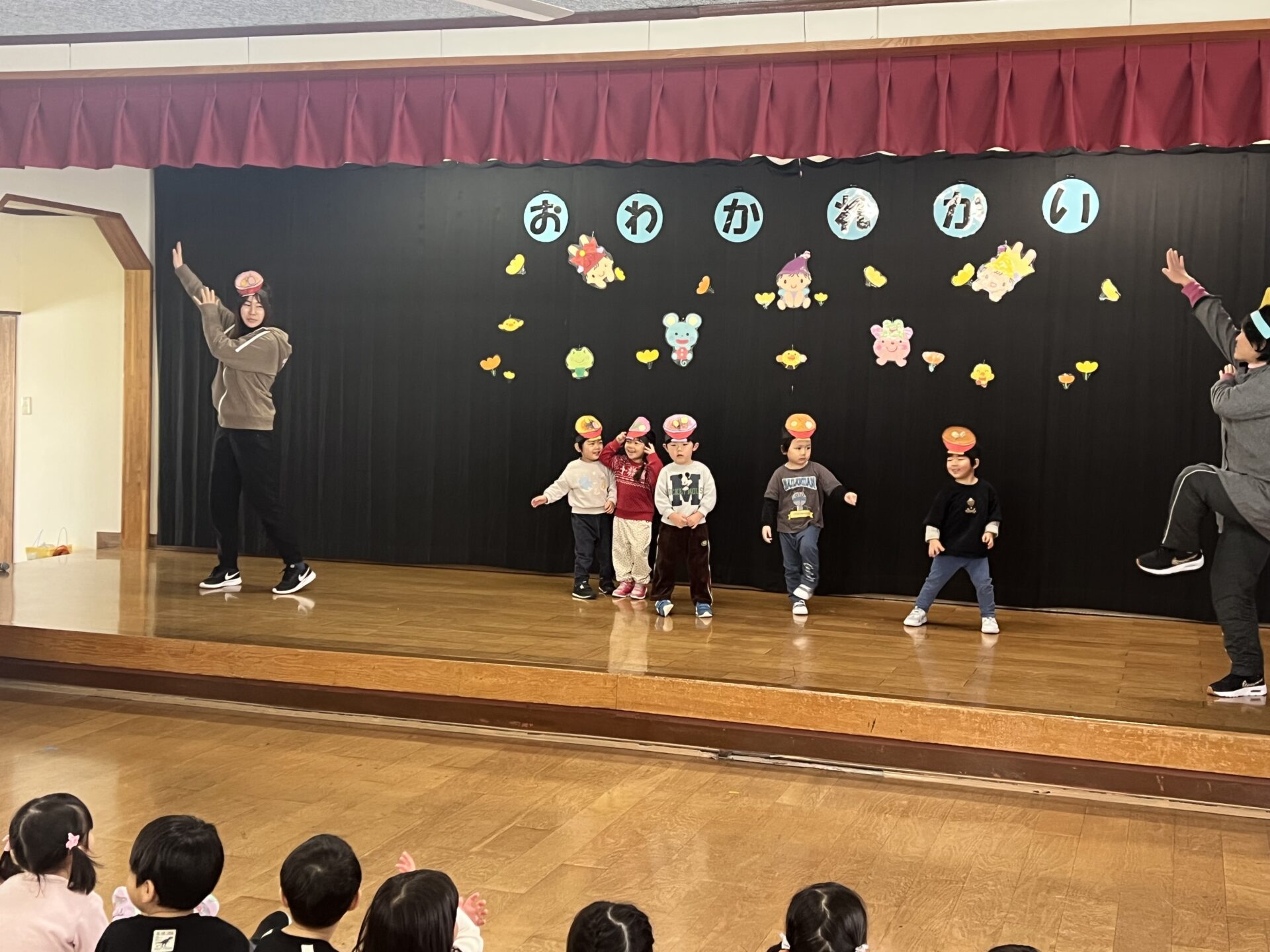 日頃から楽しんでいる体操を取り入れお面をかぶって行いました。アンコールでは、A P Tの曲に合わせてみんなでダンス!とても盛り上がりました。