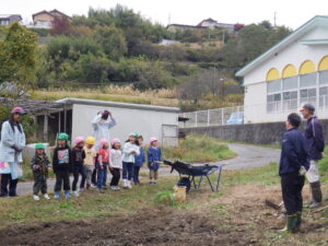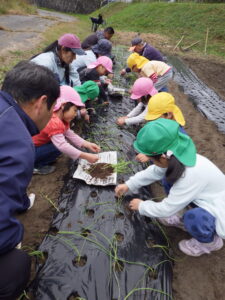 ・毎年、JAの方と農業振興会議の方が畑を耕し、畝を作り、玉ねぎの苗植えをこども達としてくださることは大変ありがたい。なかなか経験できない事を経験させていただけることで、こども達は玉ねぎを植えるまでの準備や、どのように玉ねぎができるのか、玉ねぎができるまでの苦労も感じることができると思う。地域の方々に支えられて貴重な経験をさせていただける。収穫祭ではこども達と共に、しっかり感謝を伝えていきたい。