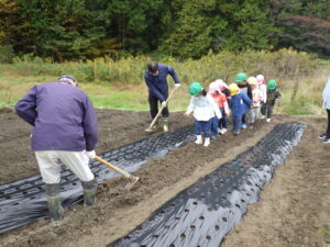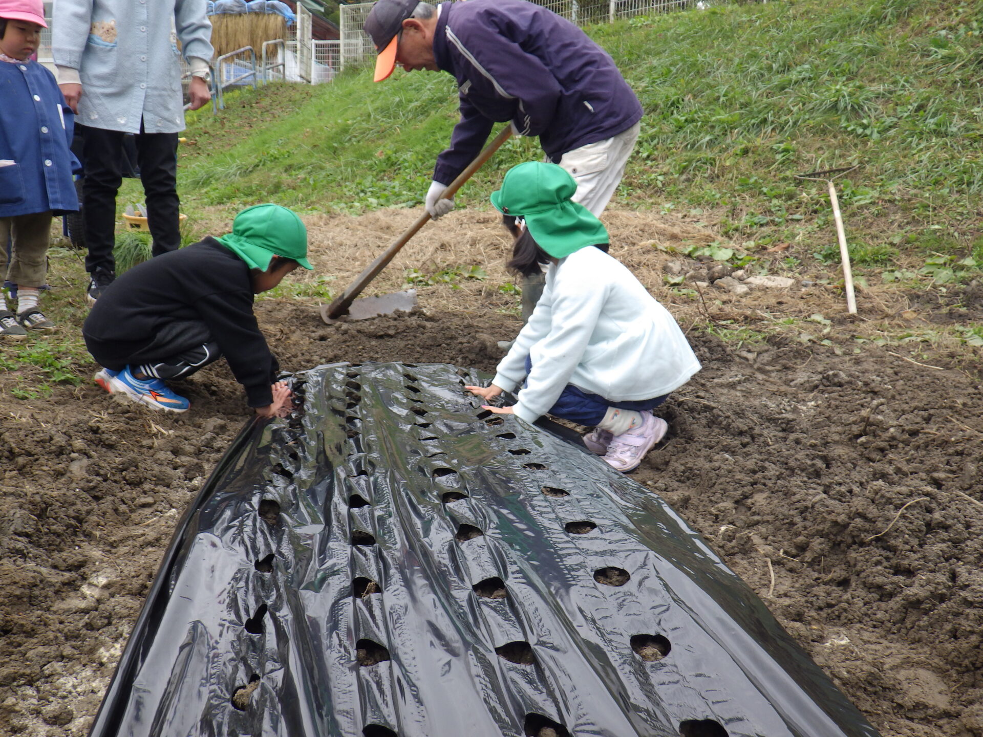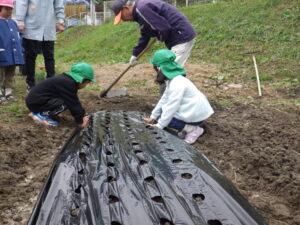 マルチが飛ばないように土を被せます。斎藤さん、林さんが被せた土の上を、こども達が歩いて踏み固めました。みんな1列になって歩いていきます。