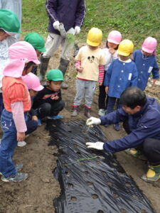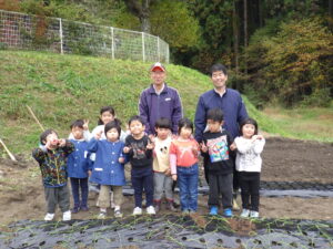 最後にみんな揃って記念撮影!来年の5月頃収穫できるそうですが、その頃には年長さんは1年生になっているので食べられません・・・。でも、大丈夫!夏休みの1年生交流の時にカレーに入れて食べますよ。「おたのしみに・・・!」