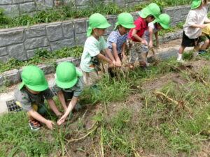 7月になり待ちに待ったじゃがいも掘り。じゃがいもの絵本を見て掘り方のイメージトレーニングはばっちり!友達と協力しながら茎を引っ張ったり、土を優しく掘ってみたり…