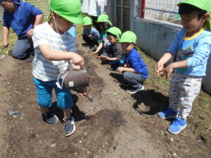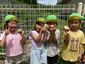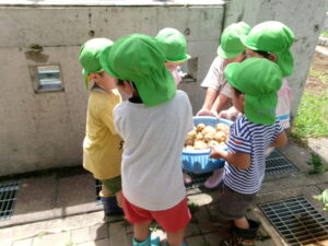 5月に年中組でじゃがいもの種芋を植えました。初めに種芋の見ると「これを植えるの?」と不思議そうな表情でした。また、芽が出ている種芋を見て「これなに?」「毒があるから食べちゃいけないんだよ!」と子ども同士教え合う姿が見られました。