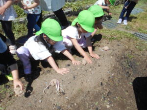 穴を掘って種芋を植えていると土の中に幼虫を発見!「幼虫がいるってことはいい土ってことだよね!」「おいしいじゃがいもができるといいね」と話しながら土の布団をかけていきました。途中から幼虫探しに夢中になる姿も・・・