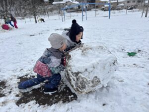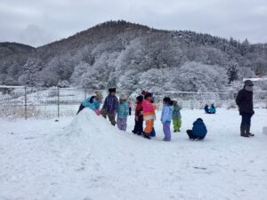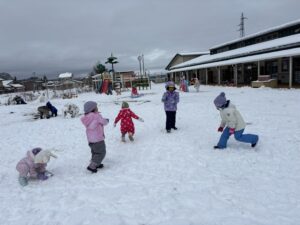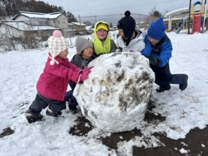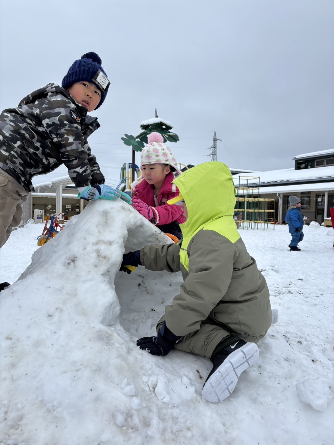 雪の中で、雪の感触を味わったり、友達と協力しながら雪山や雪だるまを作ったりする楽しさを味わって欲しいと思いました。