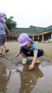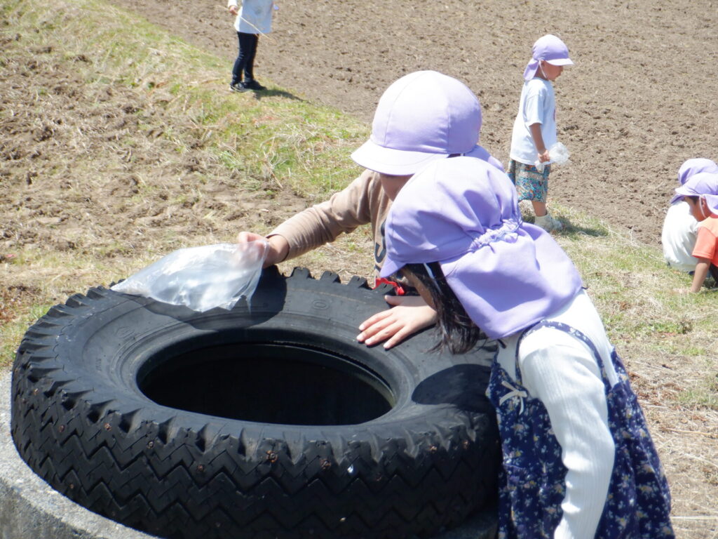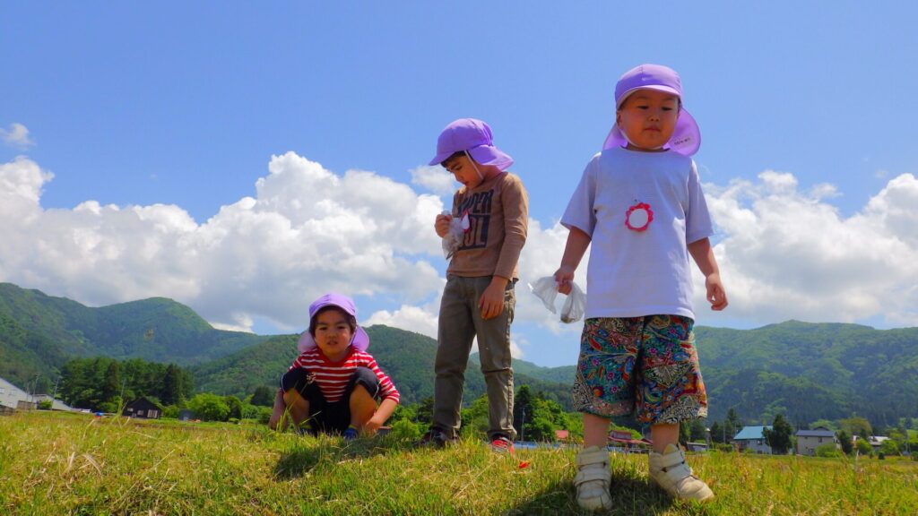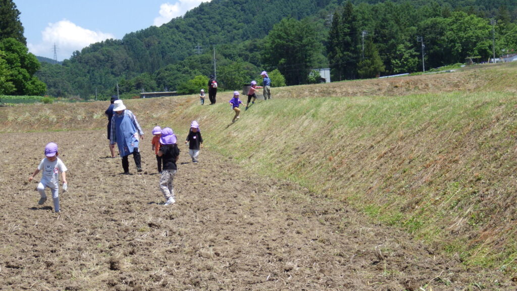 保育園の近くの田んぼへ、今年の年中さんも遊びに行きました。