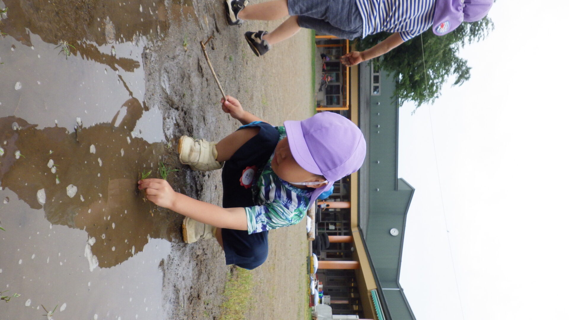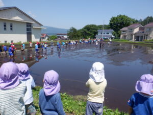 毎年小学校で行っている田植えが行われると聞き、年中と年少で見学に行きました。
