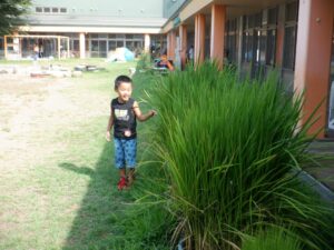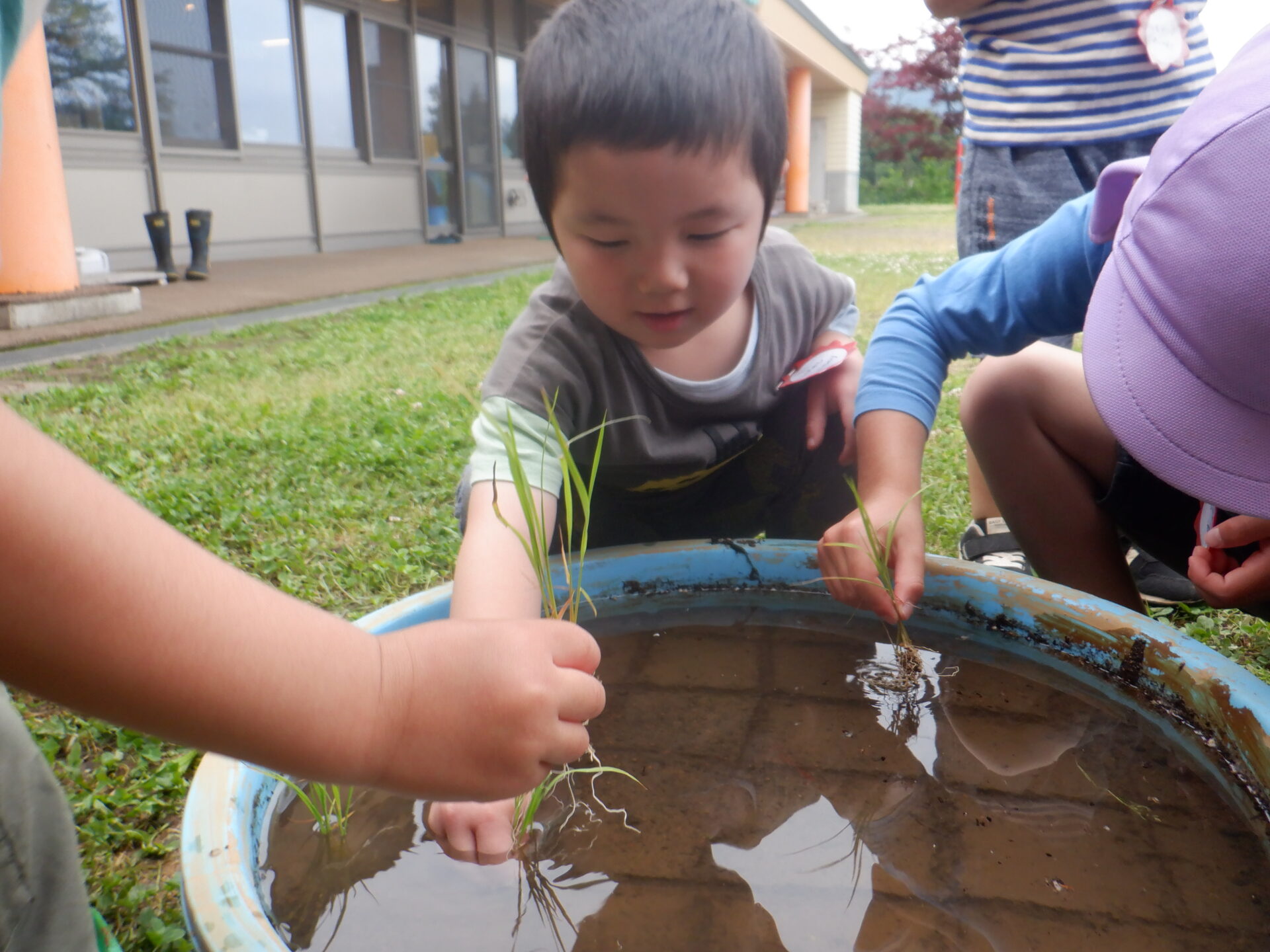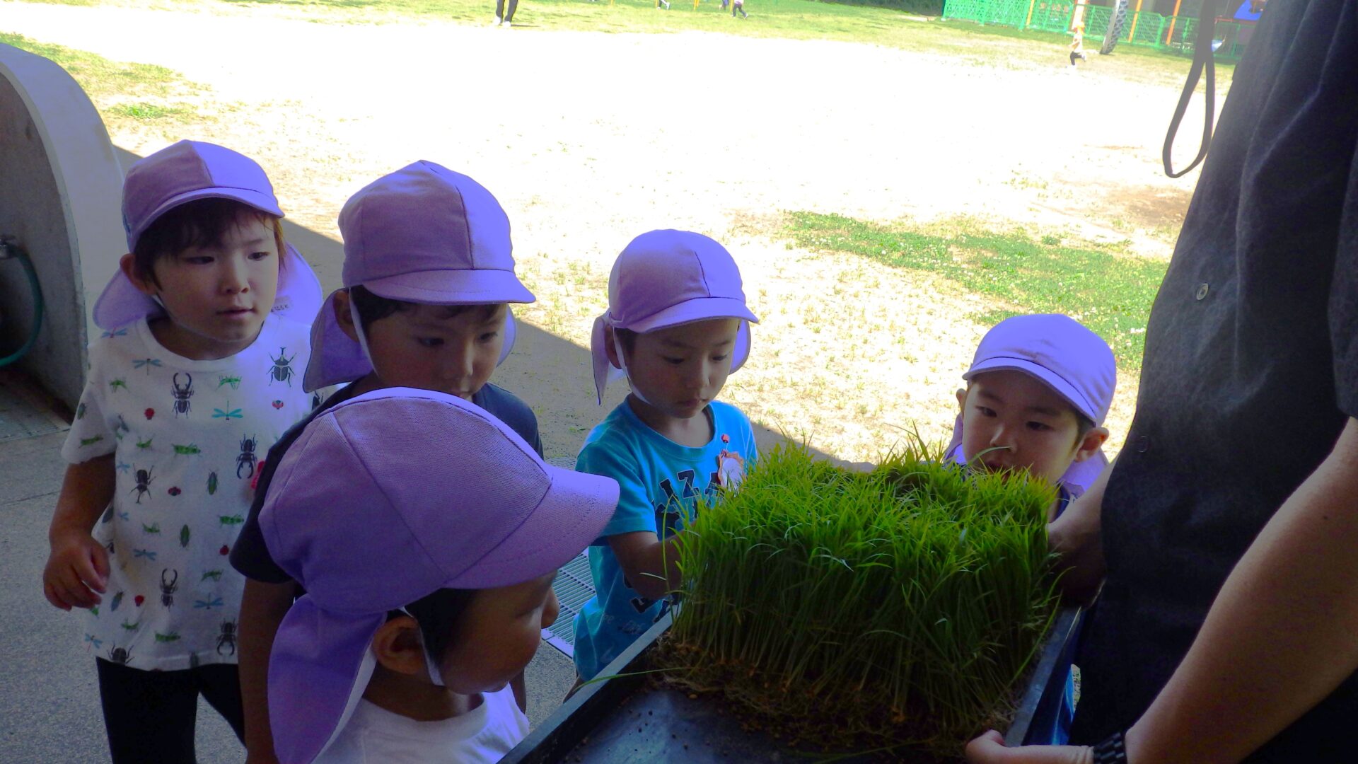 見学から保育園へ戻ってきたところで、担任が家から持ってきた稲の苗に気づく子ども達