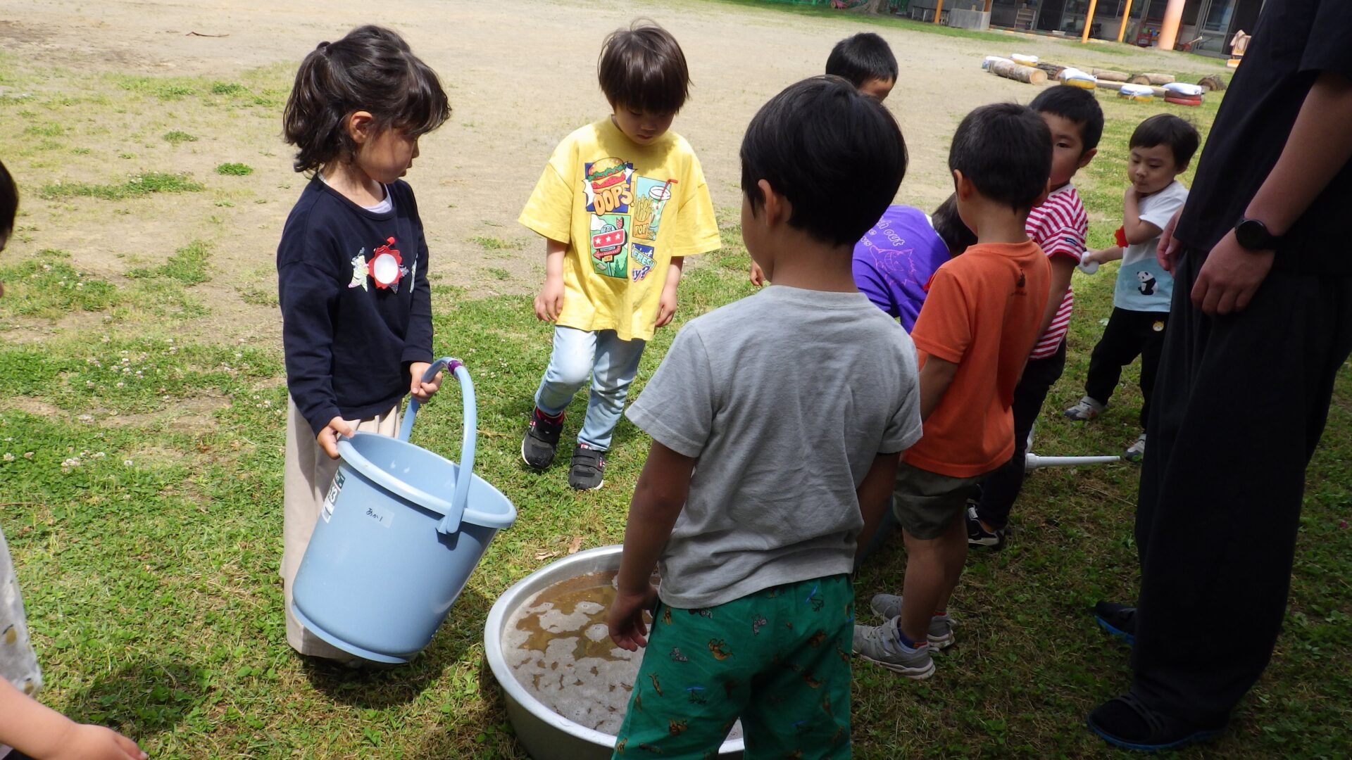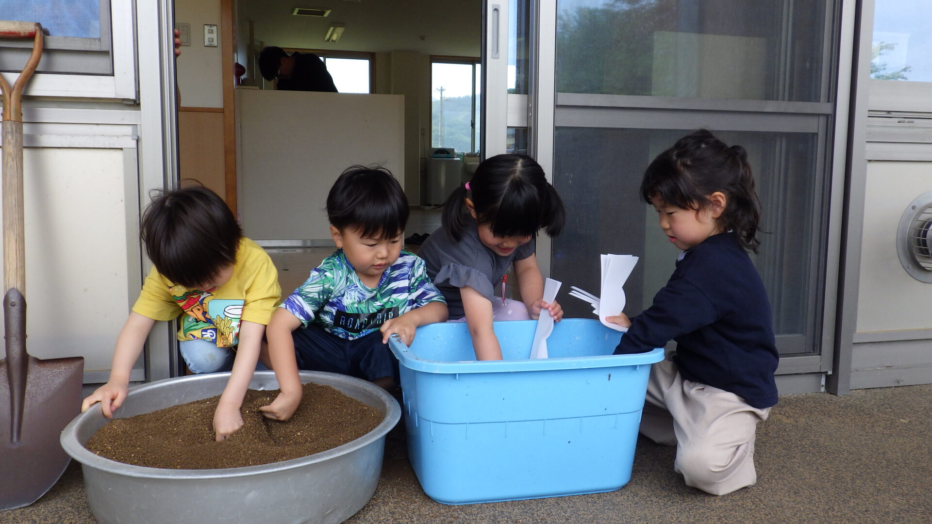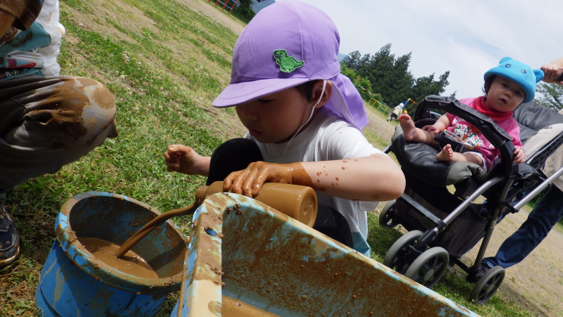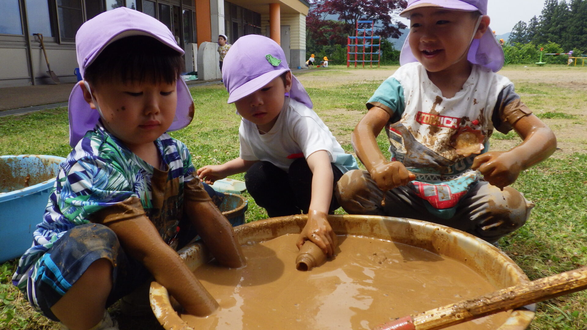 「泥団子できた!」 「シャベルでかんませればいいんじゃない?」