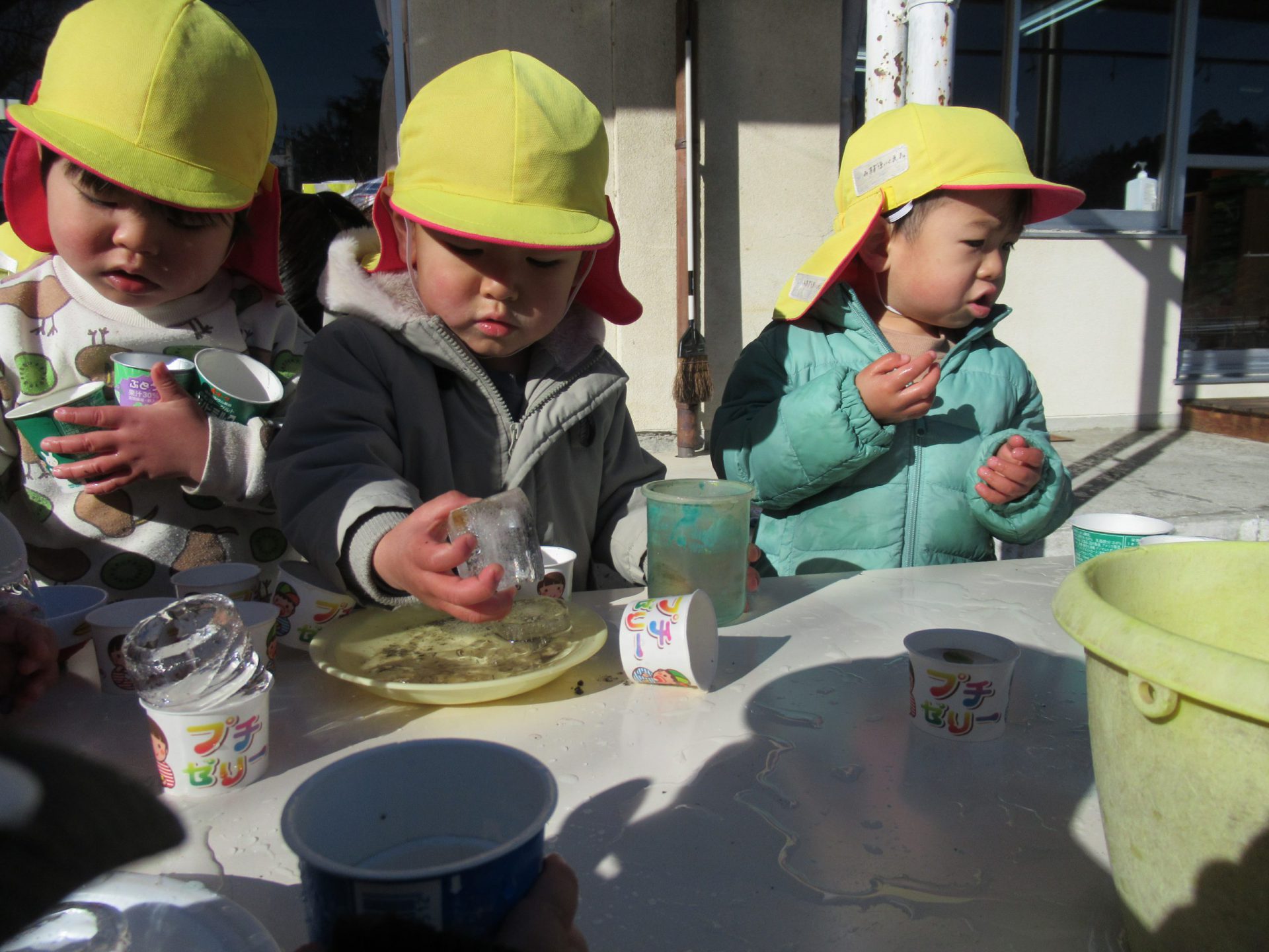 「お水が中に入っていくよ」「ひっくり返してみよう」