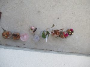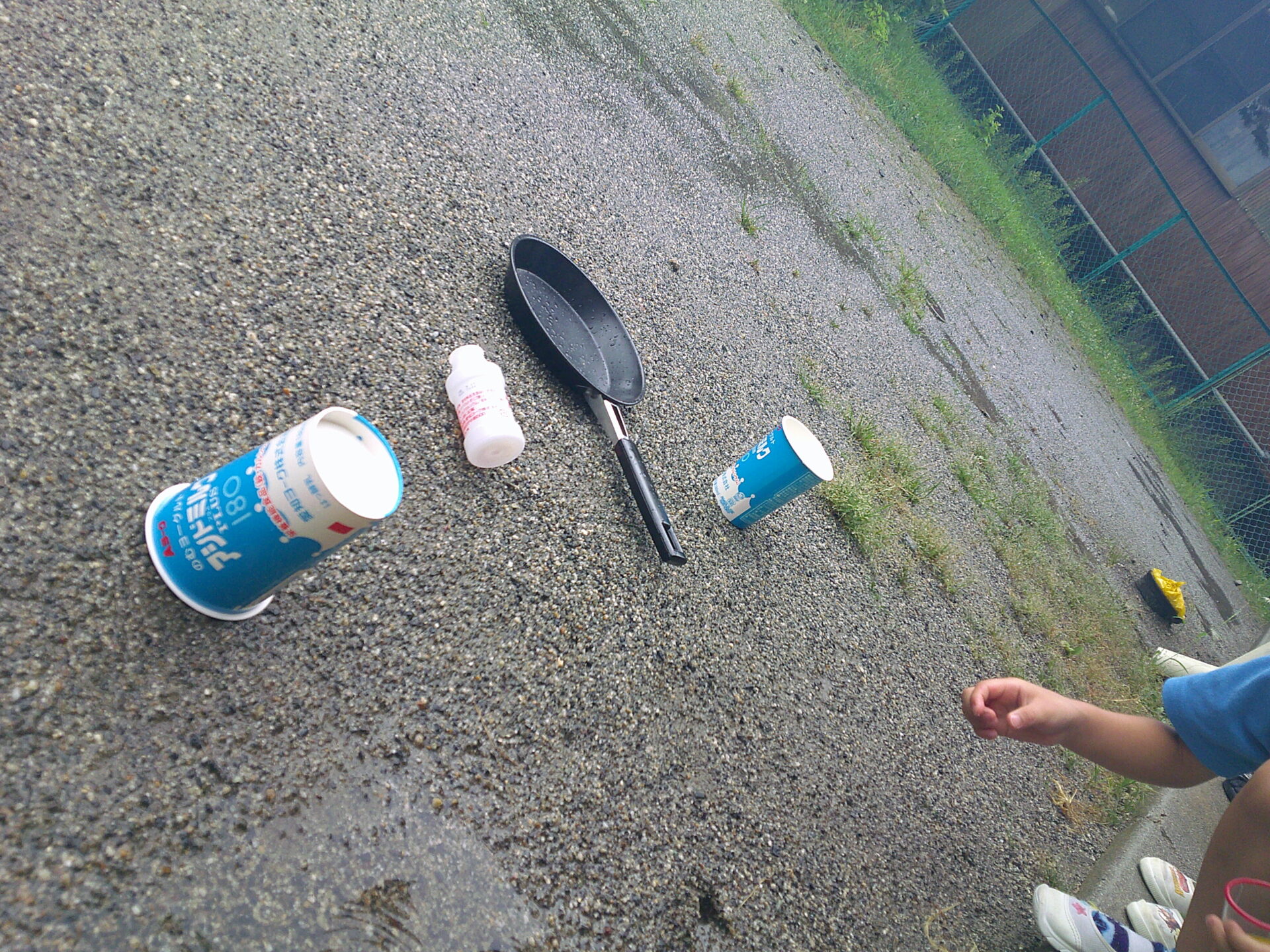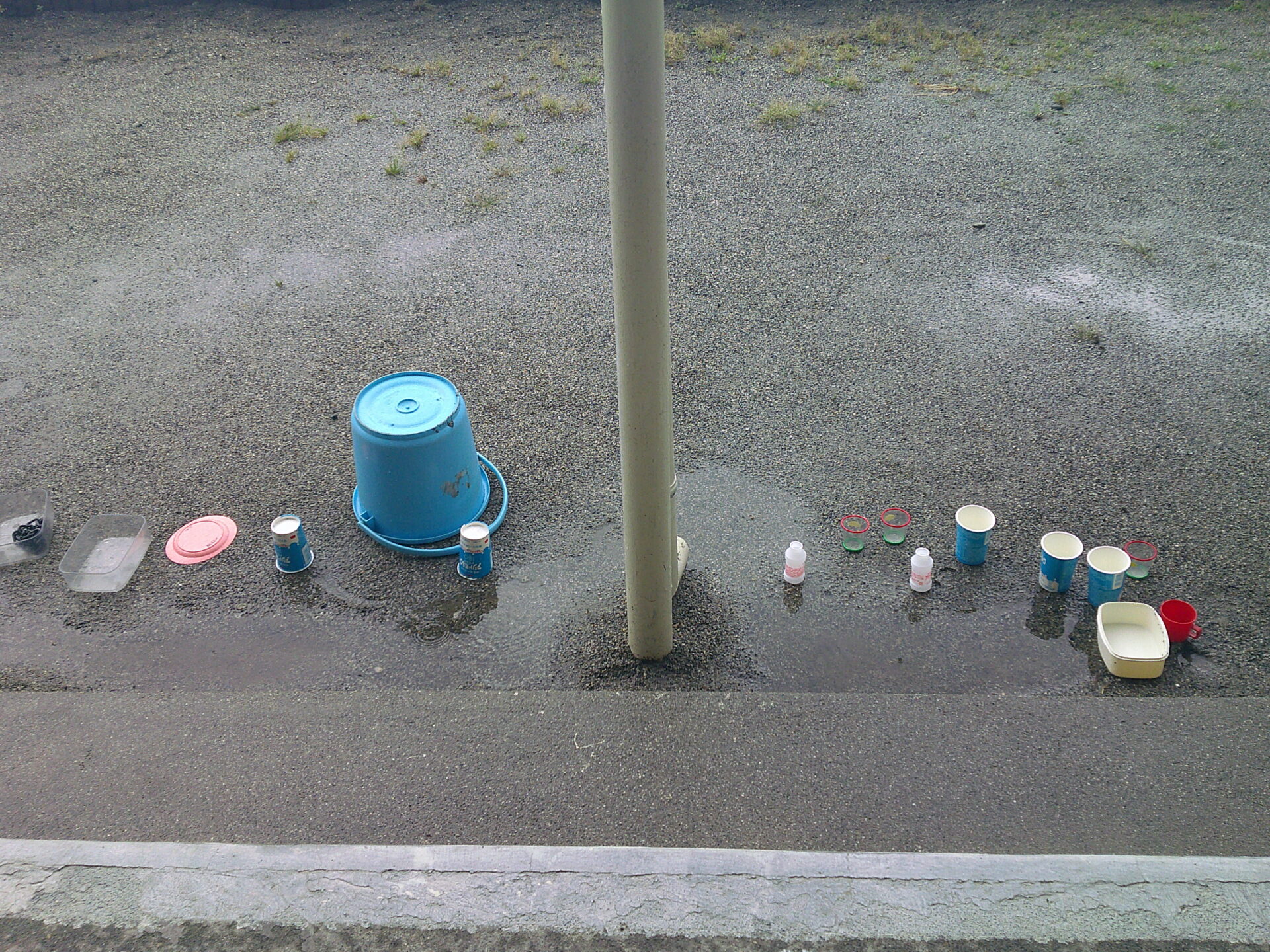 最後はおもちゃが土に汚れたので、雨にきれいにしようと外に並べておきました。