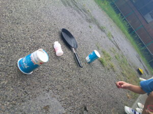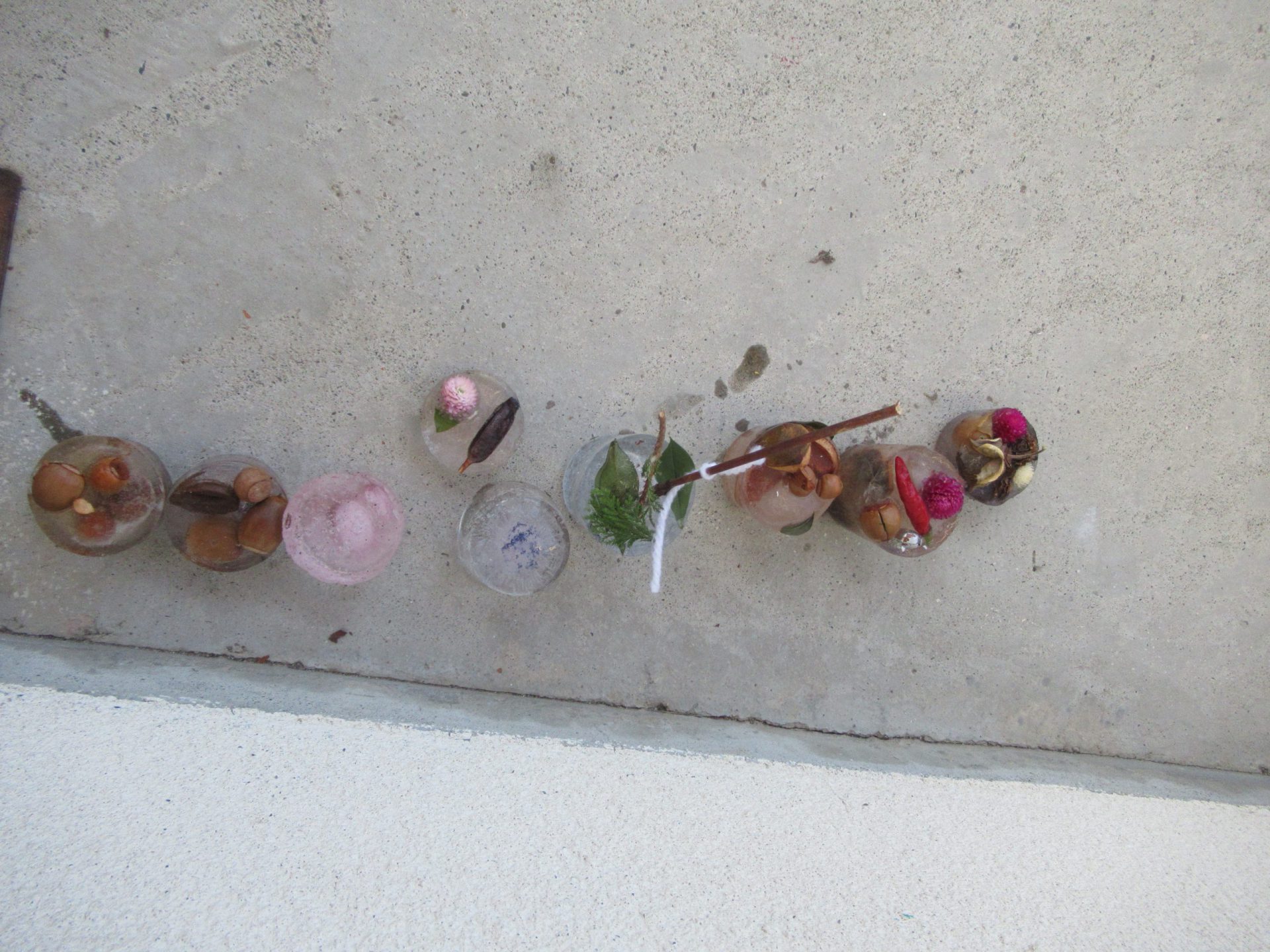 『あめのひえんそうかい』と同じように色んなものを並べてみようと、空の容器やおもちゃを置いてみました。