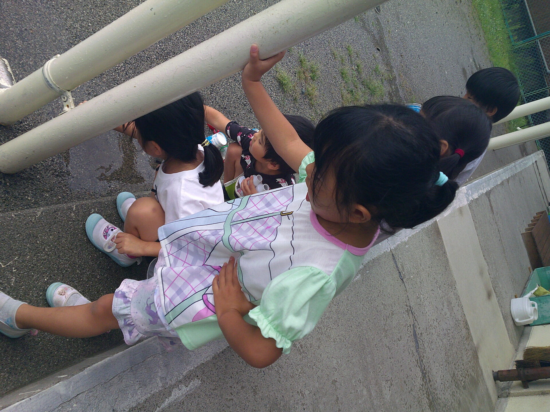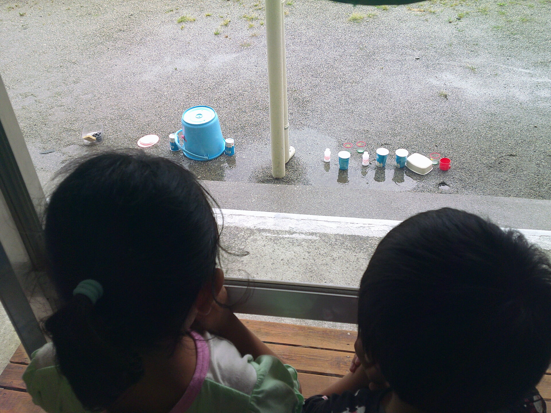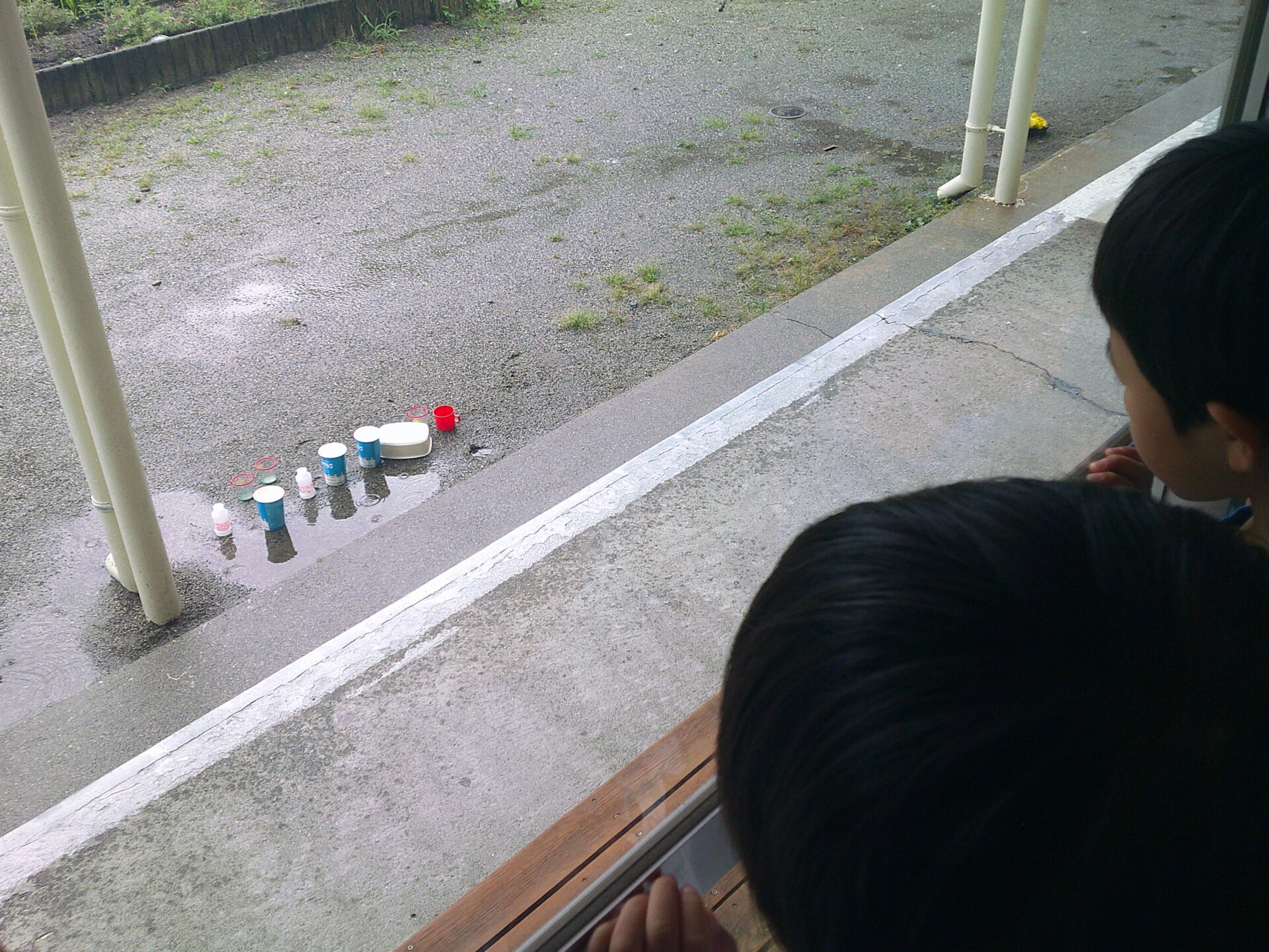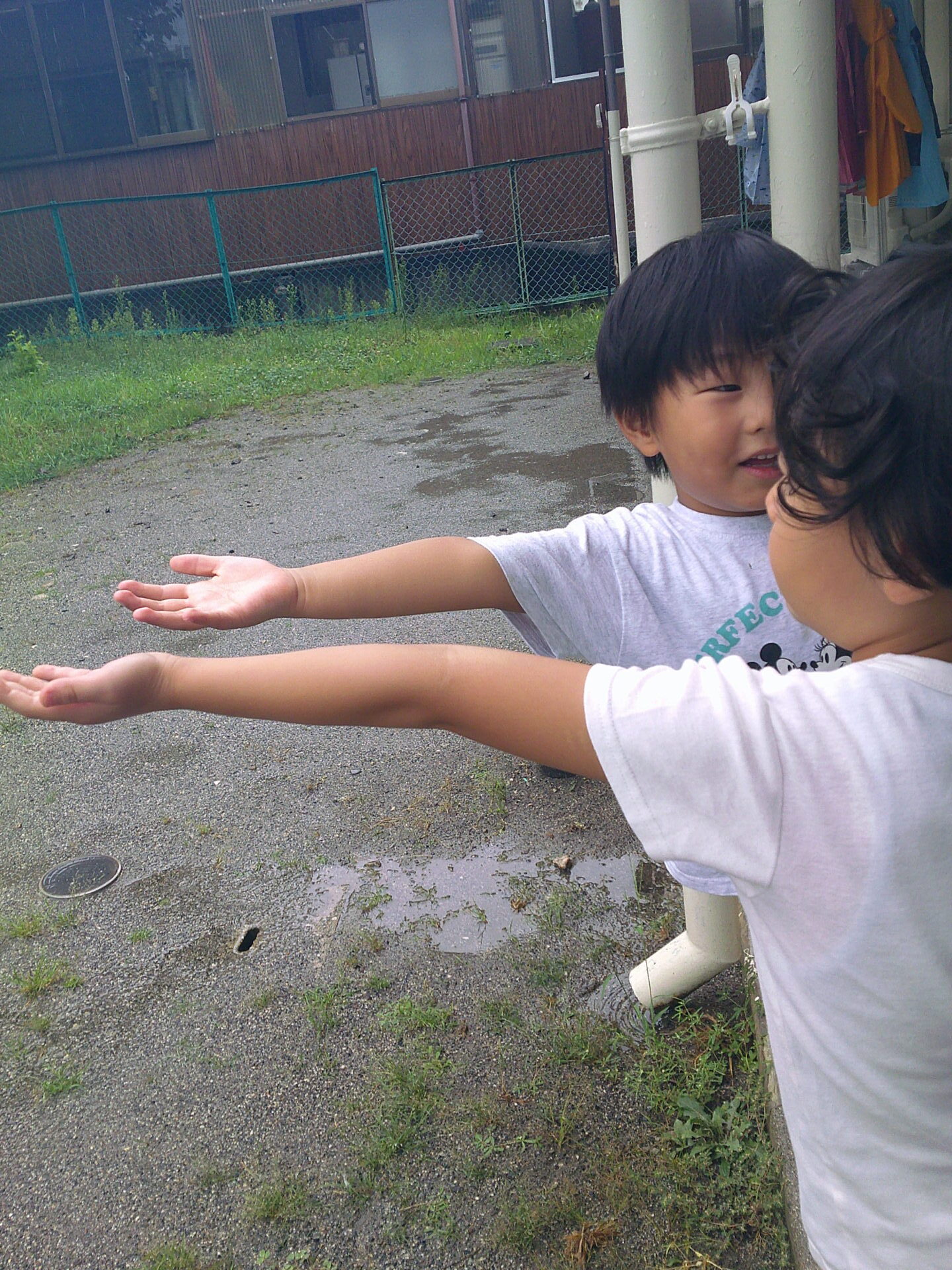 ・近くで雨を見たり、手に触れたりして興味を持っていた。