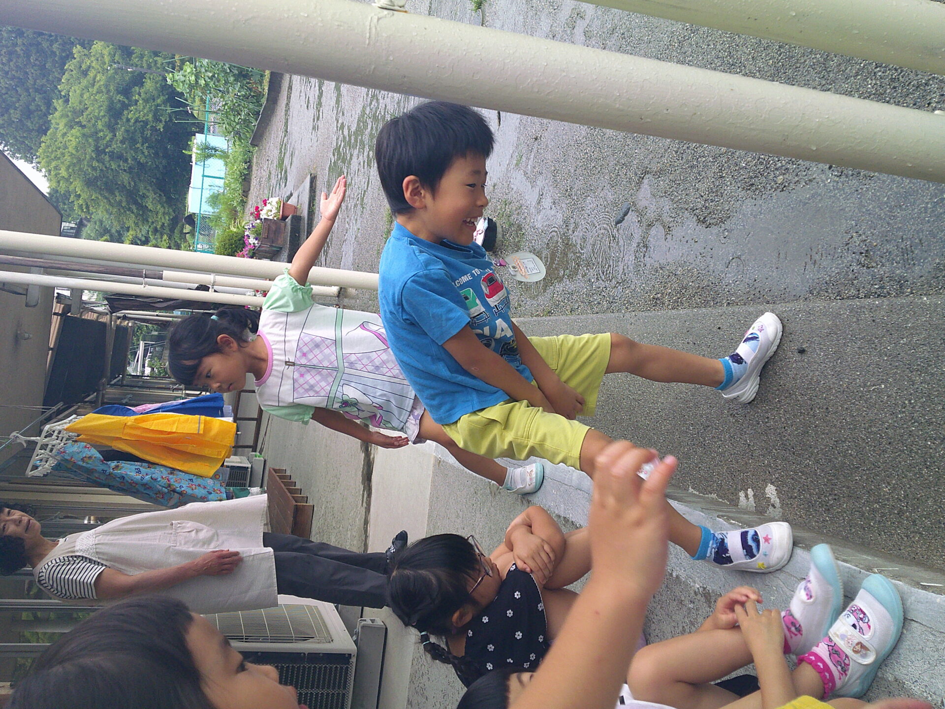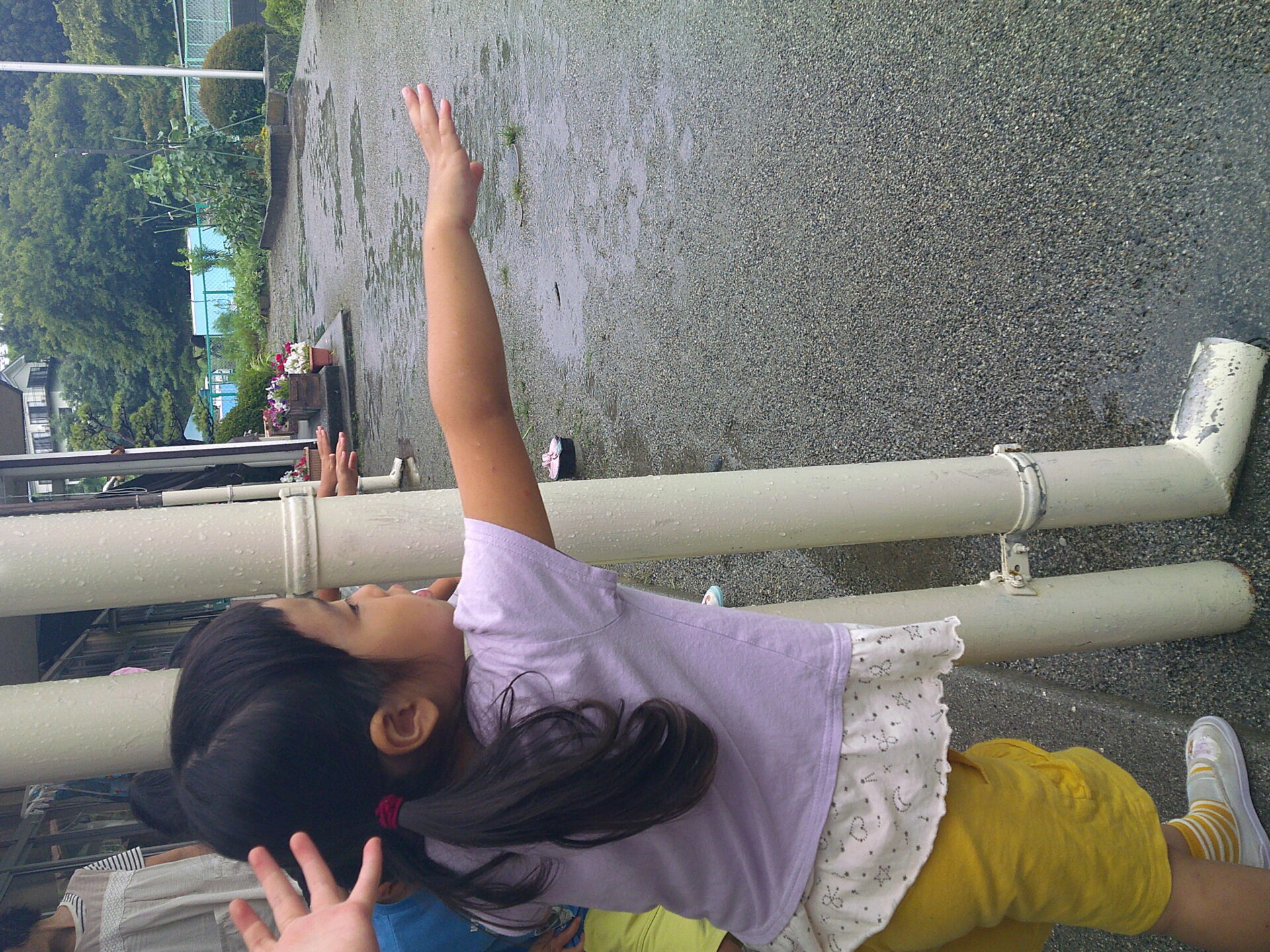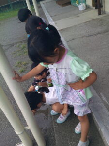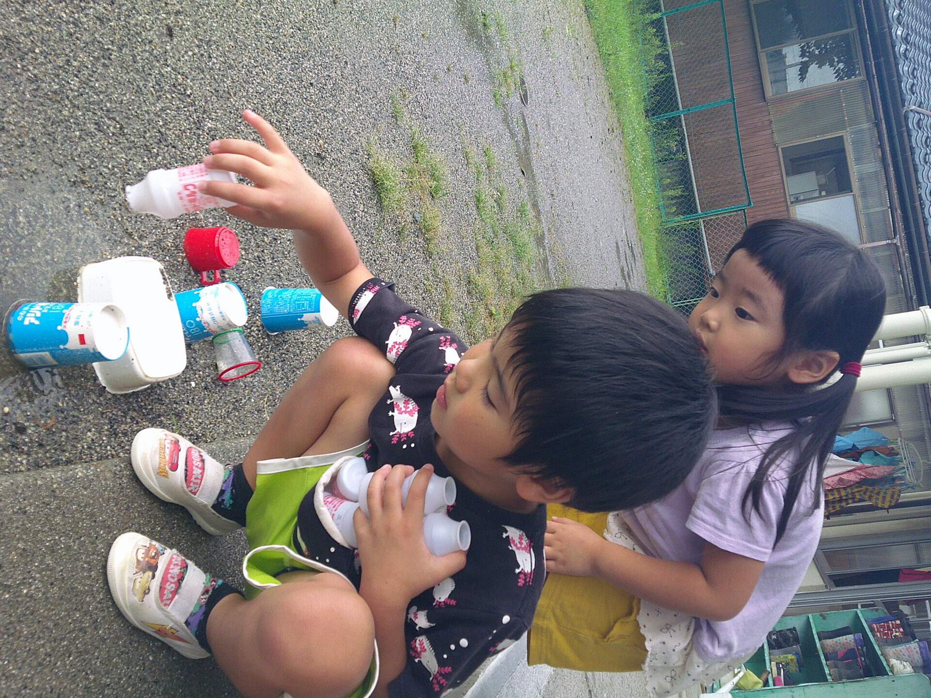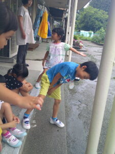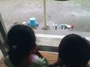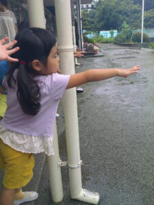 以前『あめのひえんそうかい』という絵本を読んだことがあり、「これやってみたい!」と興味を持っていたので「今日やってみる?」と提案してみました。「いいの?」「やりたい!」と興味を持った子から続々とテラスに出てきました。