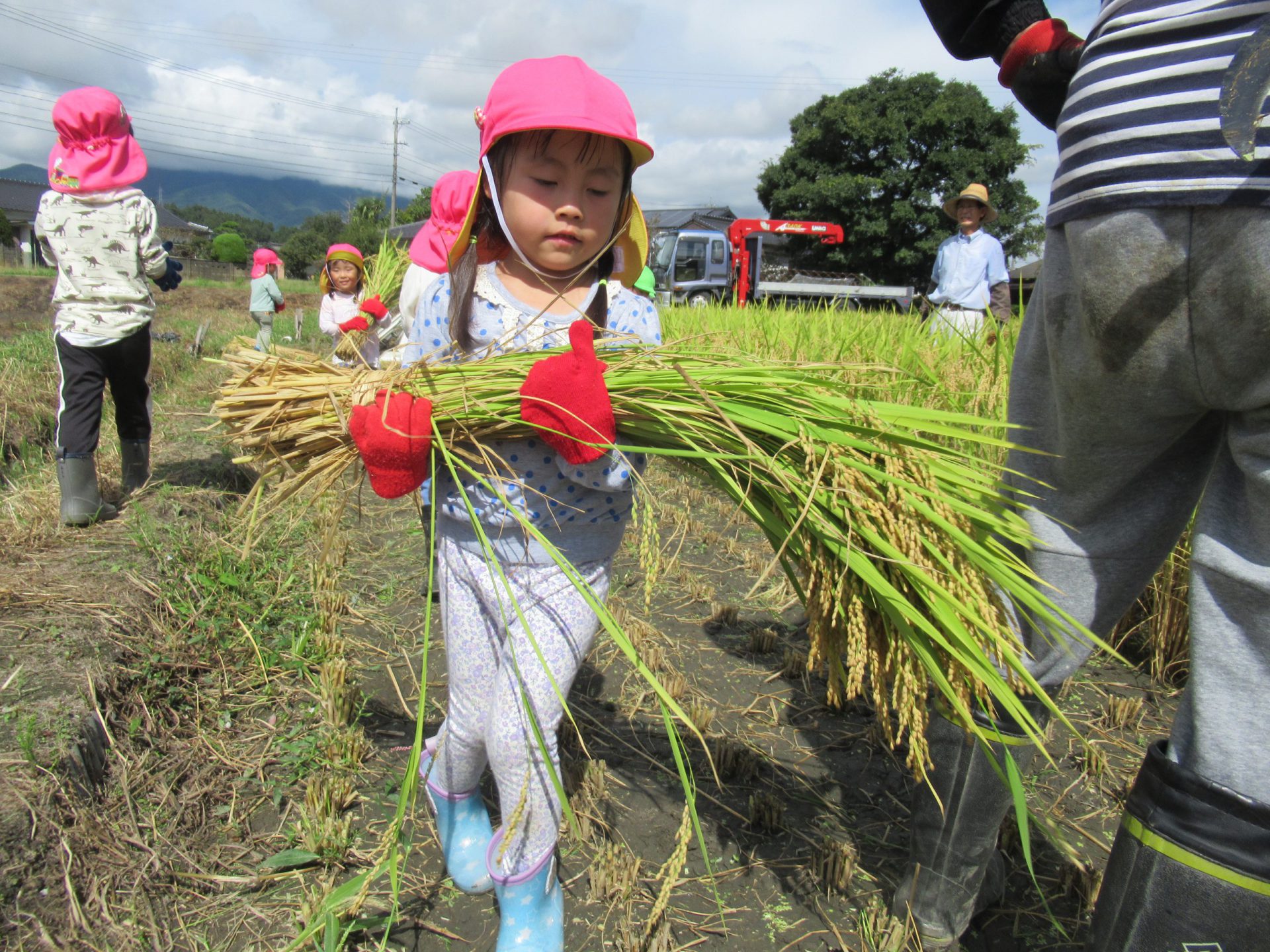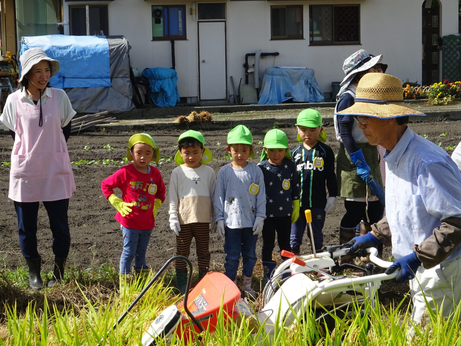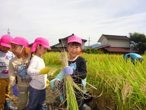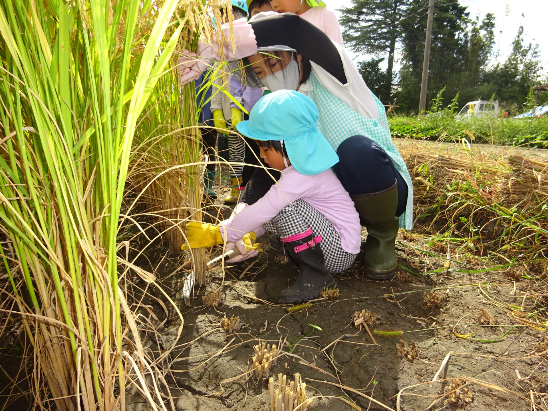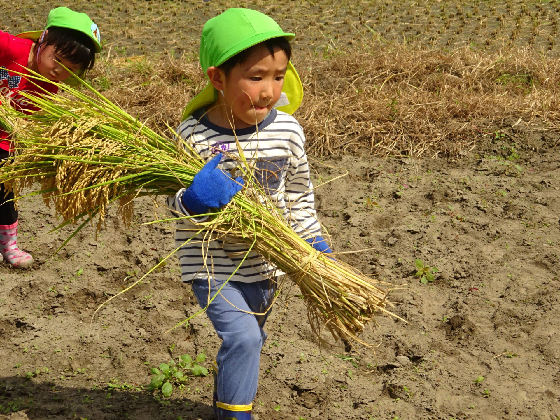 地域の方の協力を得ながら、畑や田んぼの活動をしています。春は田植え、秋は稲刈りやもちつき会といった田んぼの活動の他、畑でさまざまな野菜を育てて収穫しています。採った野菜は、園で調理して食べたり、お家へ持ち帰って食べたりと、食育につながっています。
